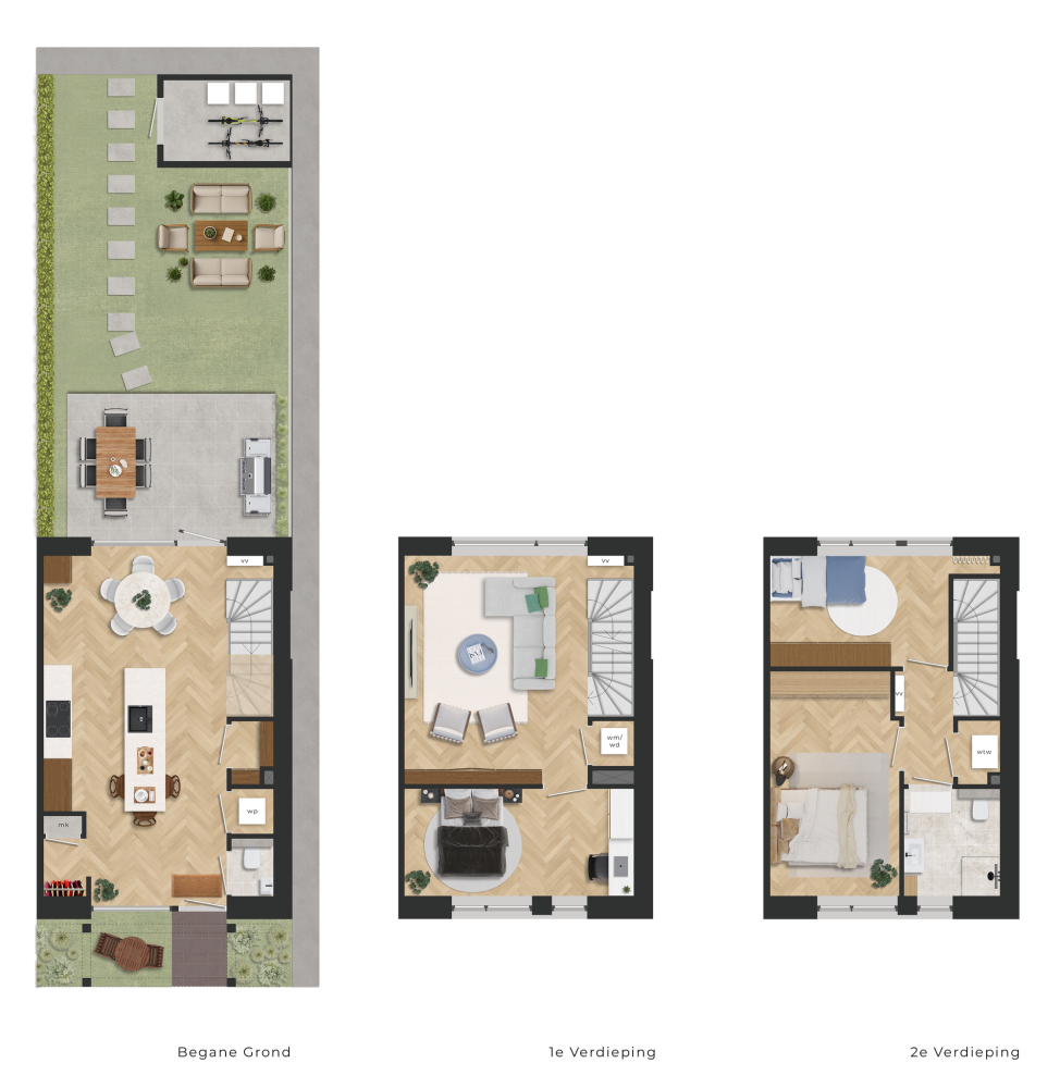 De getoonde sfeerplattegronden geven een globale indicatie van de woningen en zijn niet op schaal. Er kunnen geen rechten aan deze sfeerplattegronden ontleend worden.