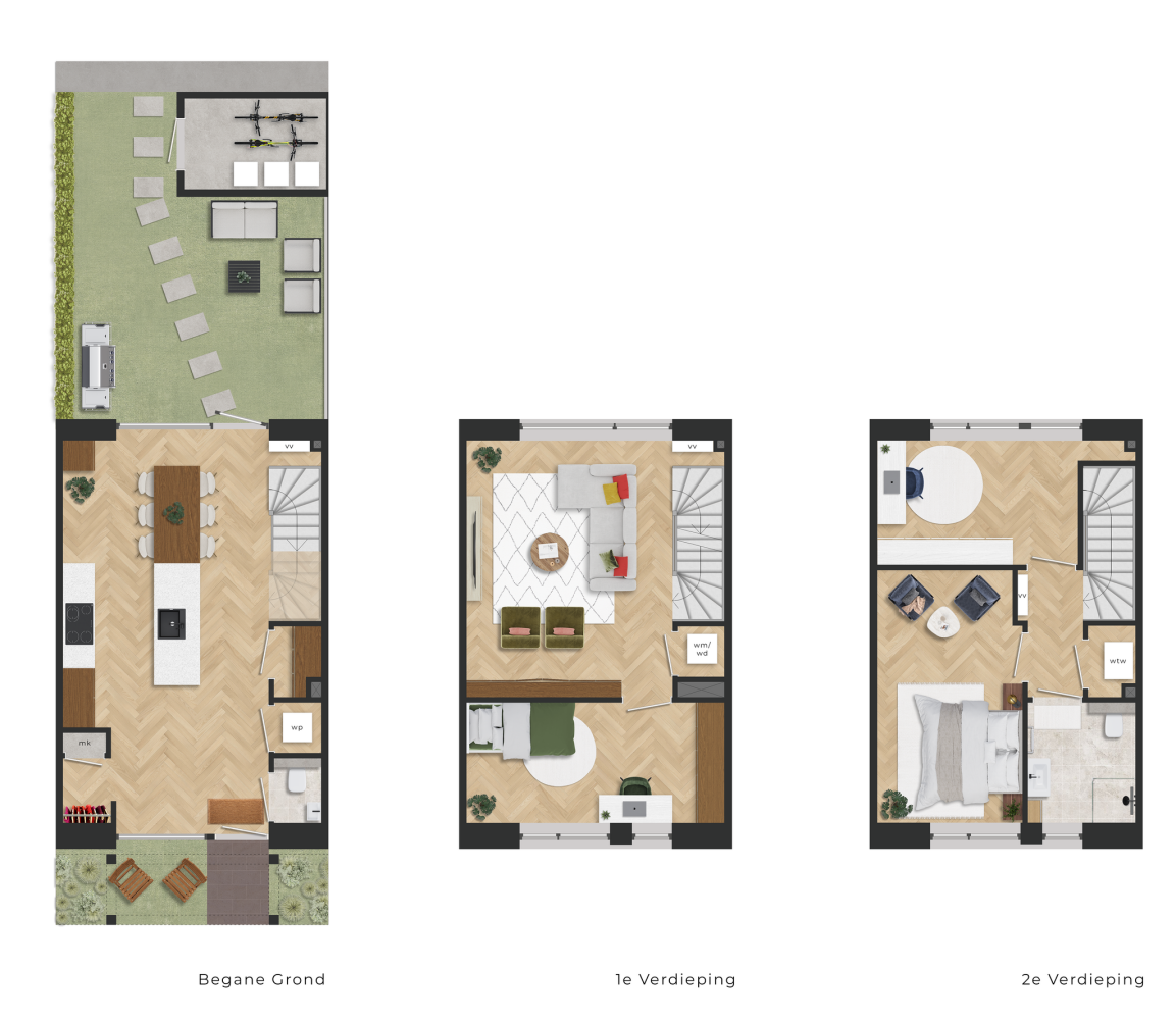 De getoonde sfeerplattegronden geven een globale indicatie van de woningen en zijn niet op schaal. Er kunnen geen rechten aan deze sfeerplattegronden ontleend worden.