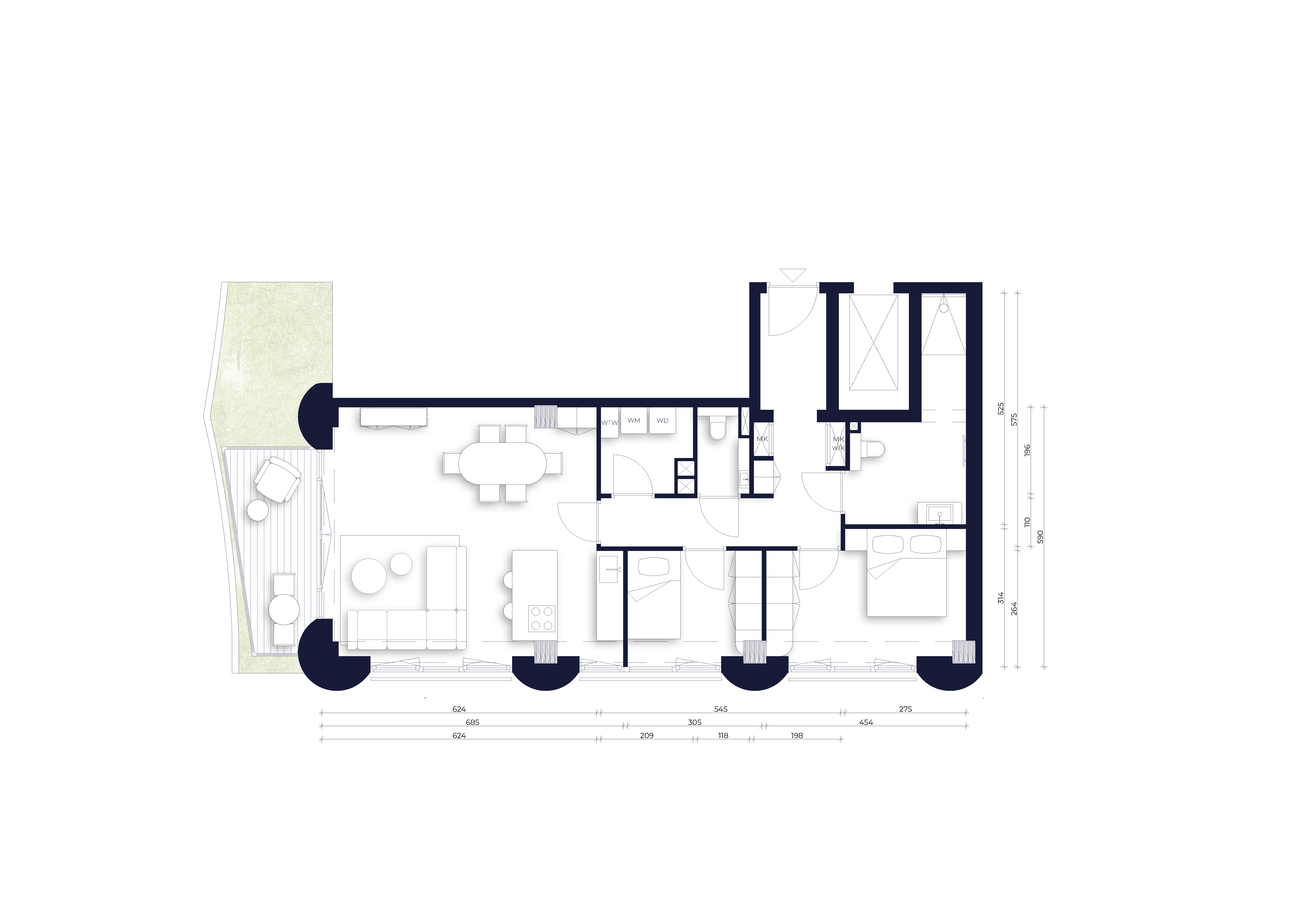This spacious corner apartment on the 5th floor enjoys a sunny southwest orientation. Large windows ensure abundant daylight in every room and a pleasant living quality. The living area occupies the corner position, with windows on two sides offering views towards the future canal along the Jaddanbaikade.The southwest-facing balcony is complemented by a planted green zone that provides privacy between balconies. The apartment features two bedrooms and one bathroom.