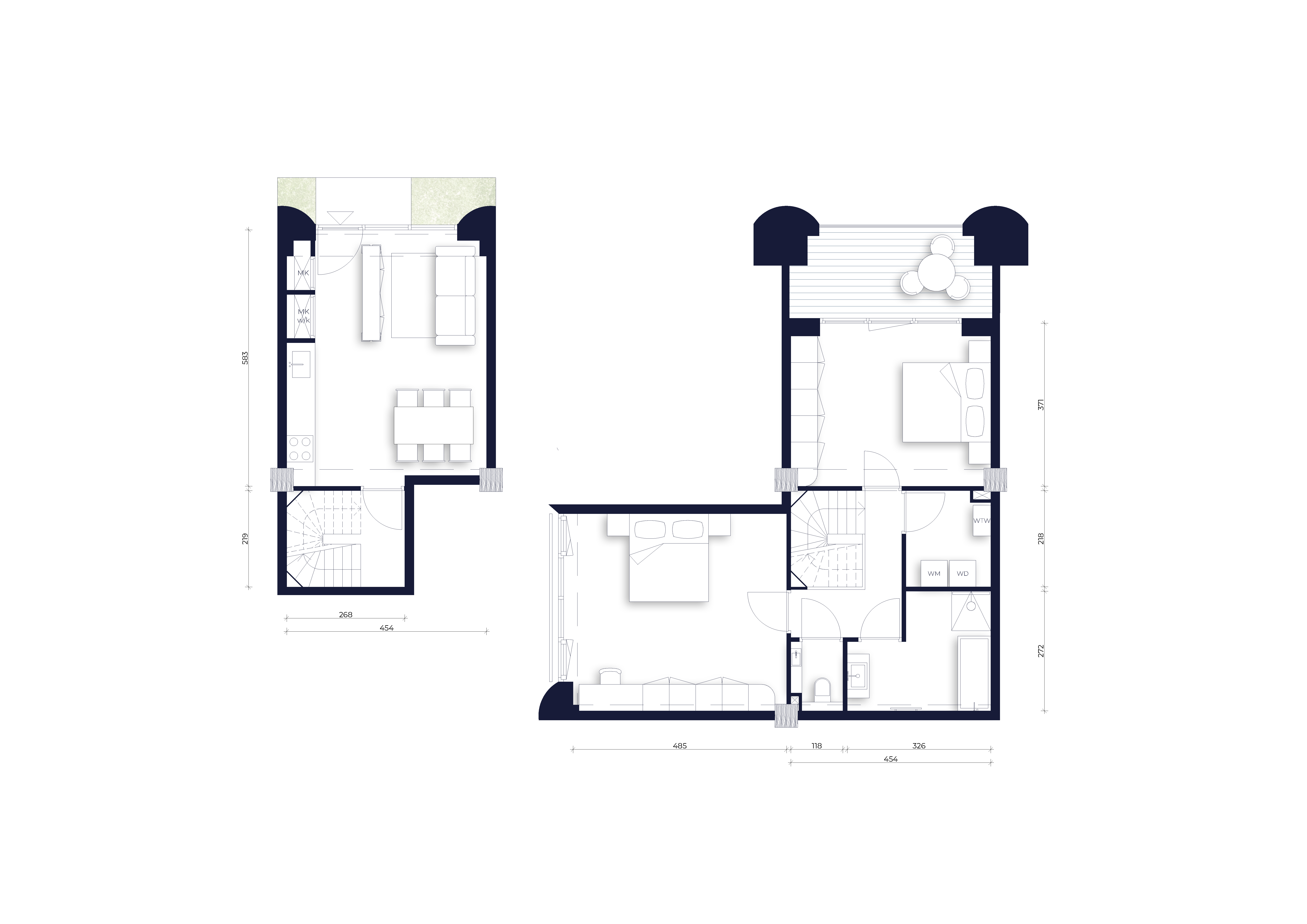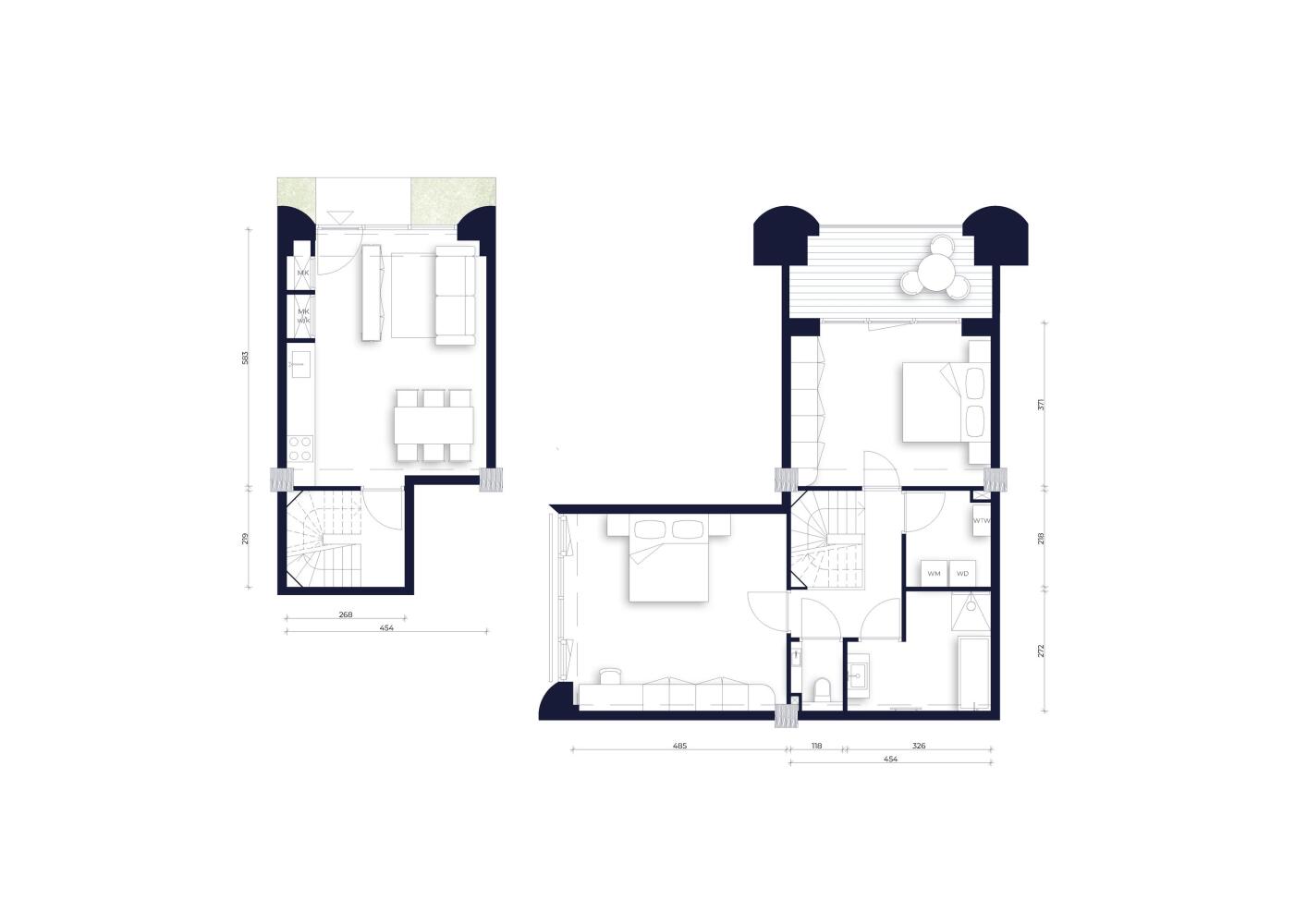 Ceci Courtyard Maisonette – living by the green inner courtyard with a private entrance. A comfortable and thoughtfully designed maisonette where privacy, light and location come together. This two-level city home on the ground floor is situated along the green Florence Pricehof. The wooden ceiling adds character to the living space. A curved staircase leads to the surprisingly spacious sleeping floor with two generous bedrooms and a bathroom. At the end of the hallway, the main bedroom opens onto the balcony. Perhaps you dream of a private studio with northern light? Here, it is possible.