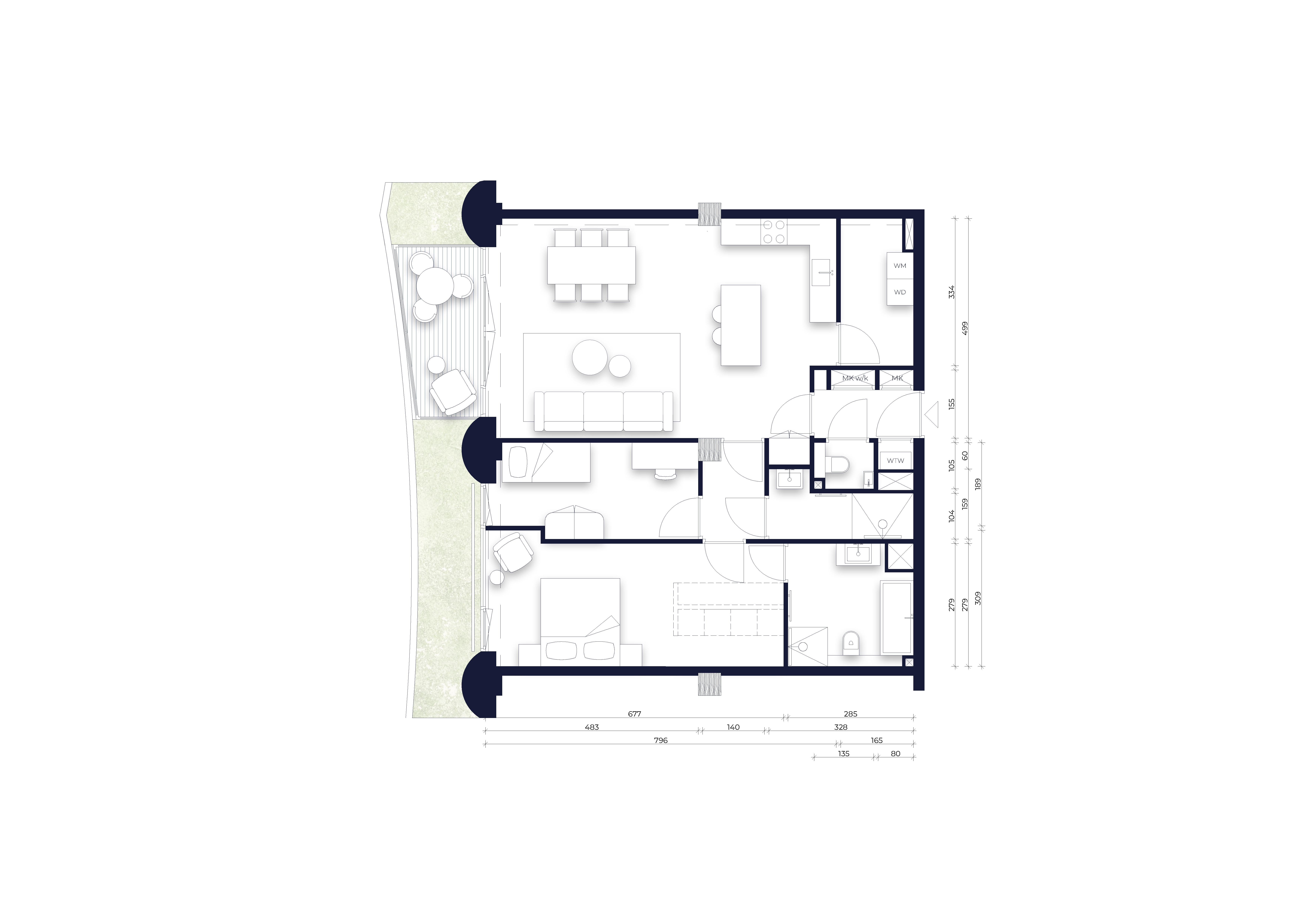 Located on the 5th floor and oriented to the west, this apartment overlooks the future canal along the Jaddanbaikade. Studio Modijefski designed a balanced layout with two bedrooms and two bathrooms. The living space has an efficient width of nearly 5 metres and connects to the west-facing balcony. There is ample room for a kitchen island and a storage room adjacent to the kitchen. Both bedrooms face the green zone beside the balcony. The main bedroom offers a hotel-suite feel with an en-suite bathroom and space for wardrobes. The second bedroom also has its own bathroom.
