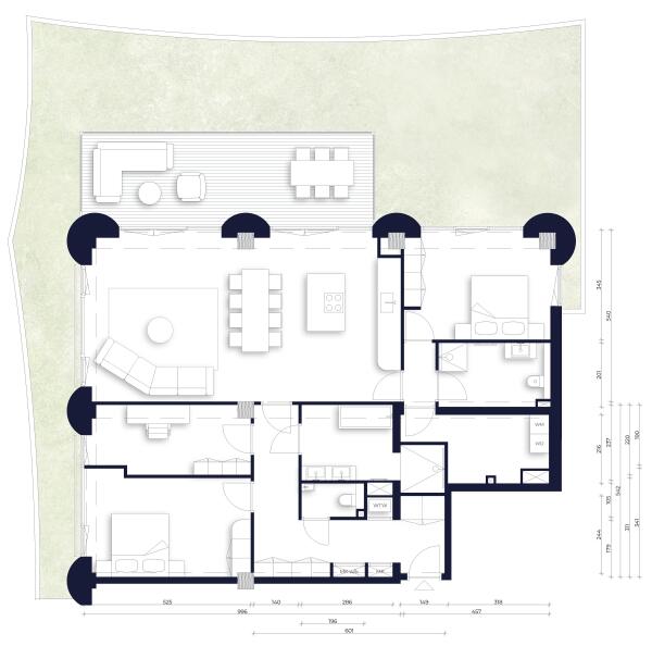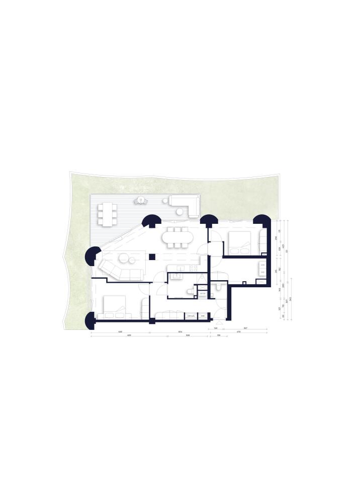 Located on the fourth floor, this Crown Residence offers single-level living comfort with a generous living area, three bedrooms and two bathrooms. The large terrace forms a natural extension of the interior and is framed by a wide strip of greenery.