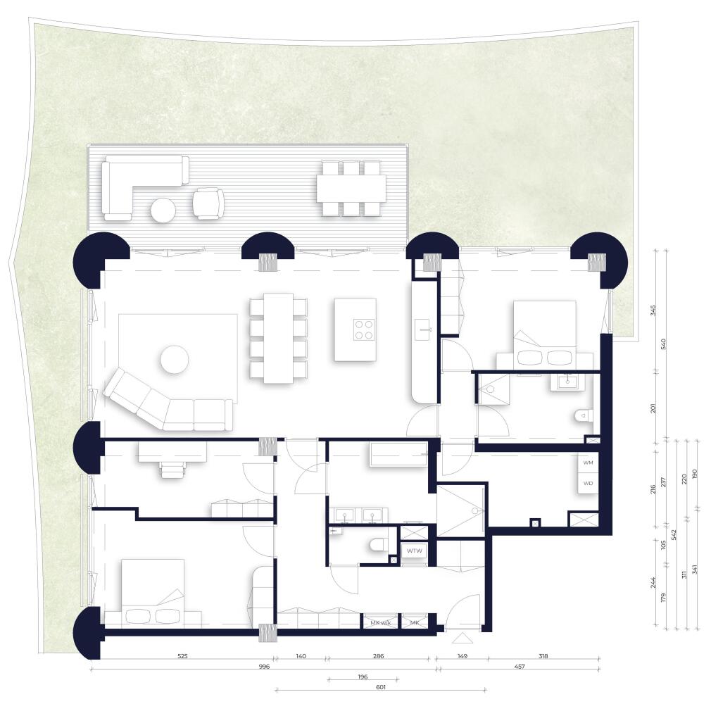 Ceci has been developed with ambitious sustainability goals. High insulation values, triple glazing, integrated solar panels and an innovative construction method using timber and recycled concrete minimise energy consumption while maximising living comfort. The result is an A+++ energy label. Underfloor heating and cooling provide a stable and comfortable indoor climate throughout the year. Triple glazing not only offers excellent insulation, but also effective sound reduction.