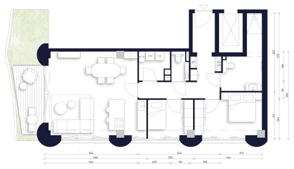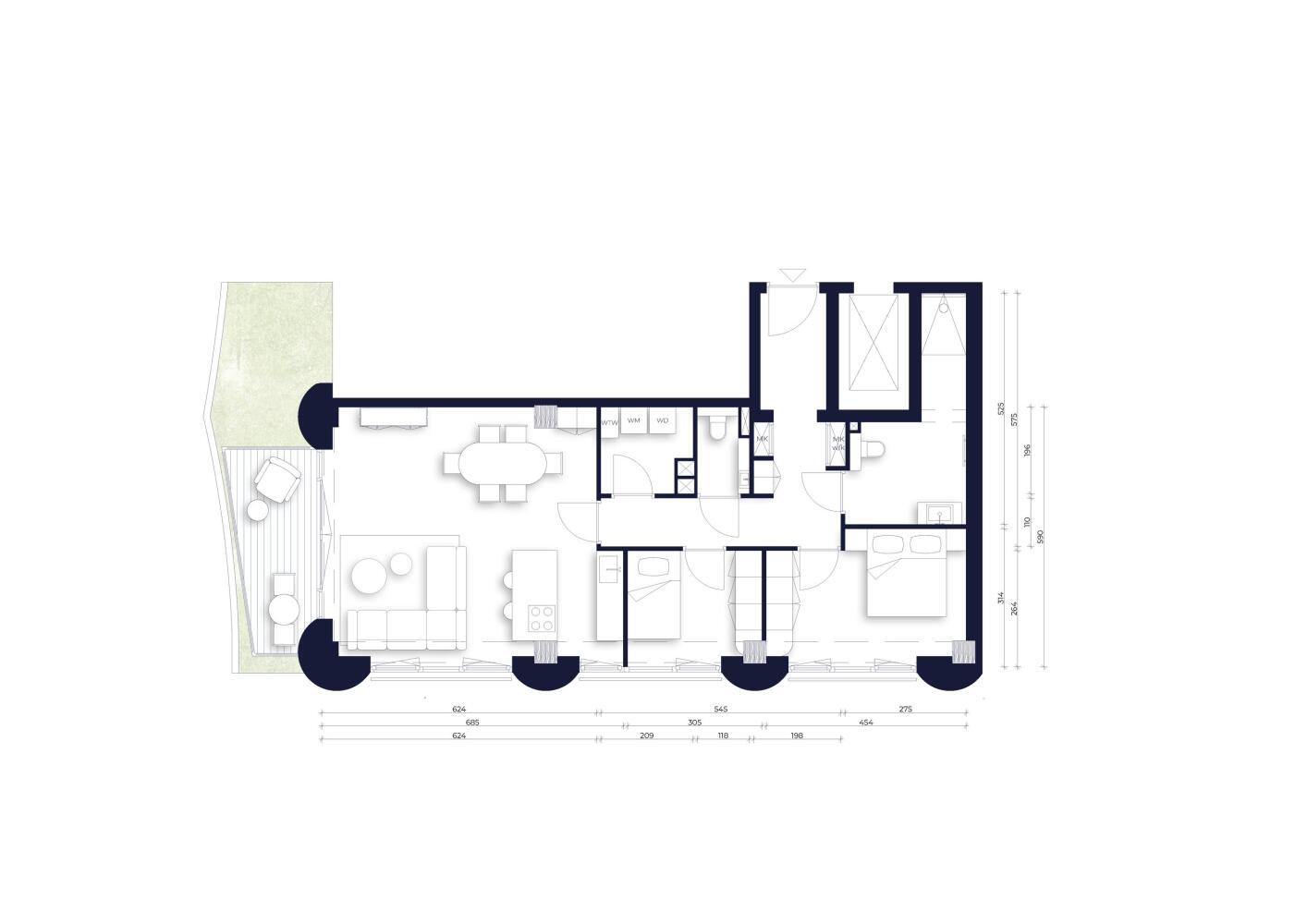 This spacious corner apartment on the 6th floor enjoys a sunny southwest orientation. Large windows ensure abundant daylight in every room and a pleasant living quality. The living area occupies the corner position, with windows on two sides offering views towards the future canal along the Jaddanbaikade.The southwest-facing balcony is complemented by a planted green zone that provides privacy between balconies. The apartment features two bedrooms and one bathroom.