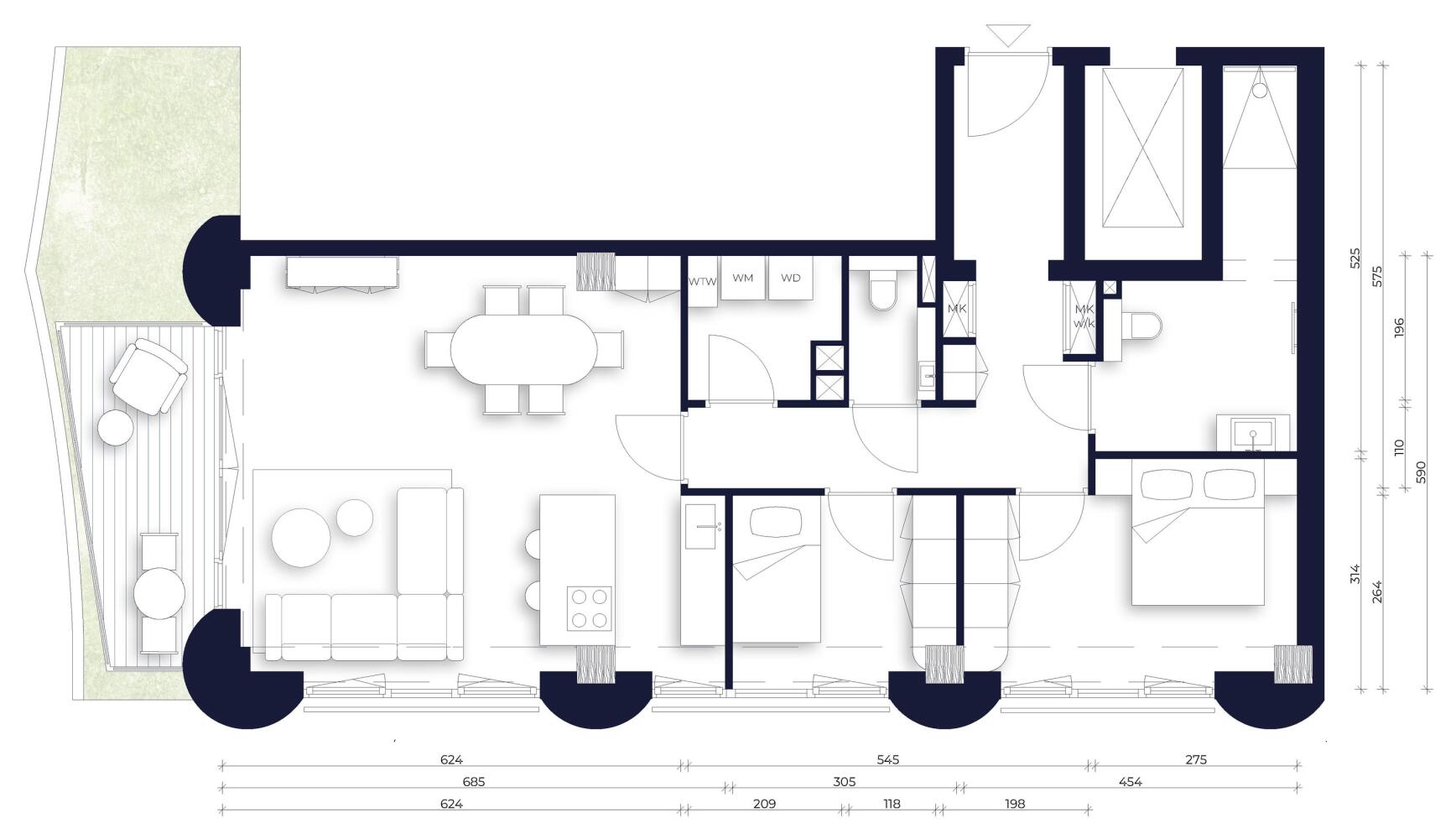Ceci has been developed with ambitious sustainability goals. High insulation values, triple glazing, integrated solar panels and an innovative construction method using timber and recycled concrete minimise energy consumption while maximising living comfort. The result is an A+++ energy label. Underfloor heating and cooling provide a stable and comfortable indoor climate throughout the year. Triple glazing not only offers excellent insulation, but also effective sound reduction.