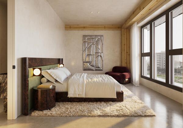 The penthouse on the 7th floor forms the absolute highlight of Ceci, offering 213 m² of living space and the building’s largest private west-facing roof terrace. The generous terrace accommodates lounging areas, an outdoor kitchen and a large dining table. Studio Modijefski designed an interior where light, space and luxury come together, using characteristic structural elements such as wooden columns, beams and ceilings. With orientations to south, west and north, the penthouse is flooded with daylight. Views of the terrace and the city beyond are framed by a striking diagonal window façade that adds architectural dynamism. The penthouse includes a private area with four (bed)rooms and three bathrooms. The main suite offers the atmosphere of a hotel suite, with a spacious bedroom, room for wardrobes and an en-suite bathroom.