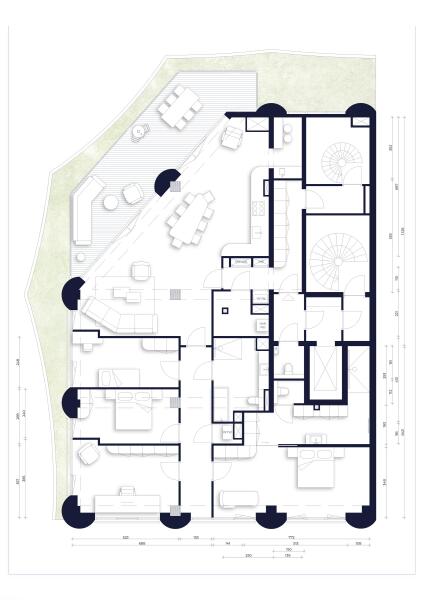 Het penthouse op de 7e verdieping vormt het absolute hoogtepunt van Ceci met 213 m² woonoppervlakte en het grootste privédakterras van het gebouw met west oriëntatie. Het royale dakterras biedt volop ruimte voor loungen, een buitenkeuken en een grote eettafel. Studio Modijefski maakte een ontwerp waar licht, ruimte en luxe samenkomen, gebruikmakend van de karakteristieke constructieve elementen zoals de houten kolommen, balken en plafond. De woning wordt prachtig omlijst door een brede strook met groene beplanting. Dankzij de oriëntatie op zuid, west en noord baadt de woning in daglicht. Het zicht op het terras en de stad daarachter vanuit de living wordt omlijst door grote een diagonale raampartij die de architectuur extra dynamiek geeft. Het penthouse biedt ruimte aan een privé-gedeelte met vier (slaap)kamers en drie badkamers. De royale hoofdsuite geeft het gevoel van een hotelsuite met een slaapkamer met ruimte voor kastenwanden en een en-suite badkamer.
