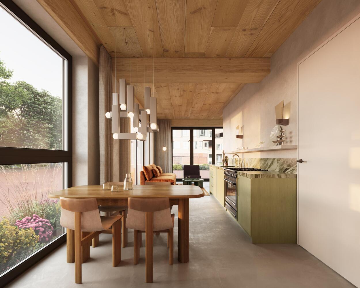 Ceci Courtyard Maisonette: living by the green inner courtyard with a private entrance.This two-level corner maisonette on the ground floor combines urban living with greenery. The living area is filled with daylight through a large window overlooking the green façade garden along the Jaddanbaikade and the Florence Pricehof. A wooden ceiling enhances the atmosphere. The open kitchen connects the sitting and dining areas. On the ground floor, the living space adjoins a bedroom or study, as well as the bathroom. The second bedroom is located on the first floor and opens onto the balcony, forming a quiet, self-contained suite with its own outdoor space and a separate toilet.