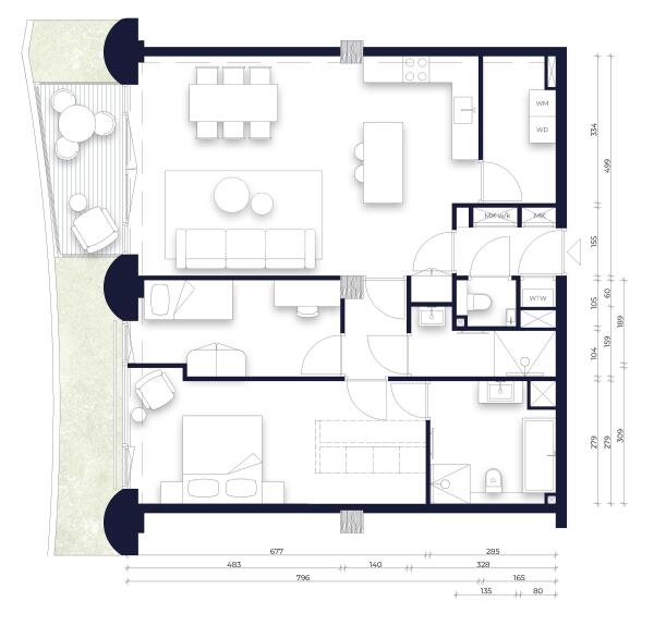 Located on the 1st floor and oriented to the west, this apartment overlooks the future canal along the Jaddanbaikade. Studio Modijefski designed a balanced layout with two bedrooms and two bathrooms. The living space has an efficient width of nearly 5 metres and connects to the west-facing balcony. There is ample room for a kitchen island and a storage room adjacent to the kitchen. Both bedrooms face the green zone beside the balcony. The main bedroom offers a hotel-suite feel with an en-suite bathroom and space for wardrobes. The second bedroom also has its own bathroom.