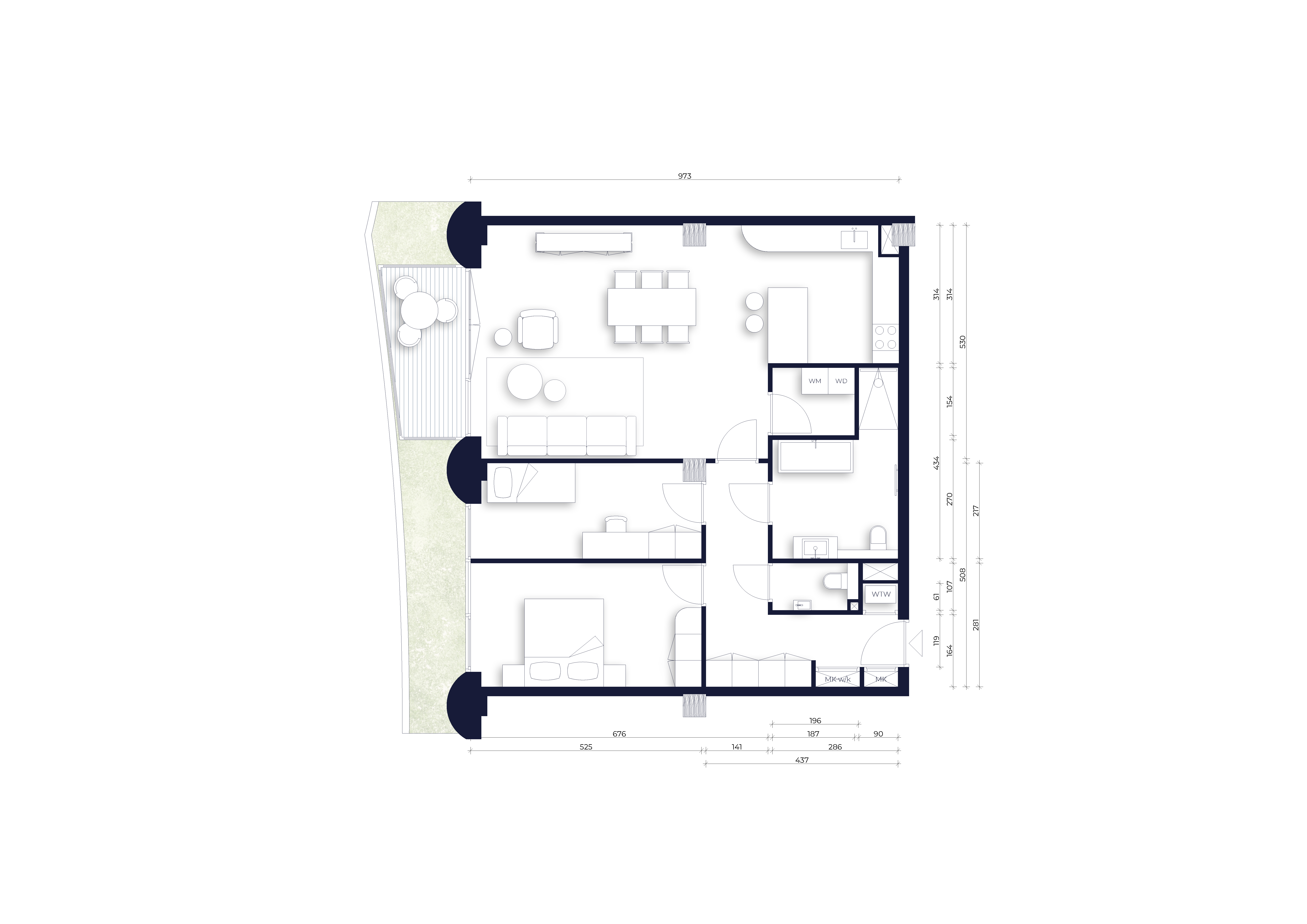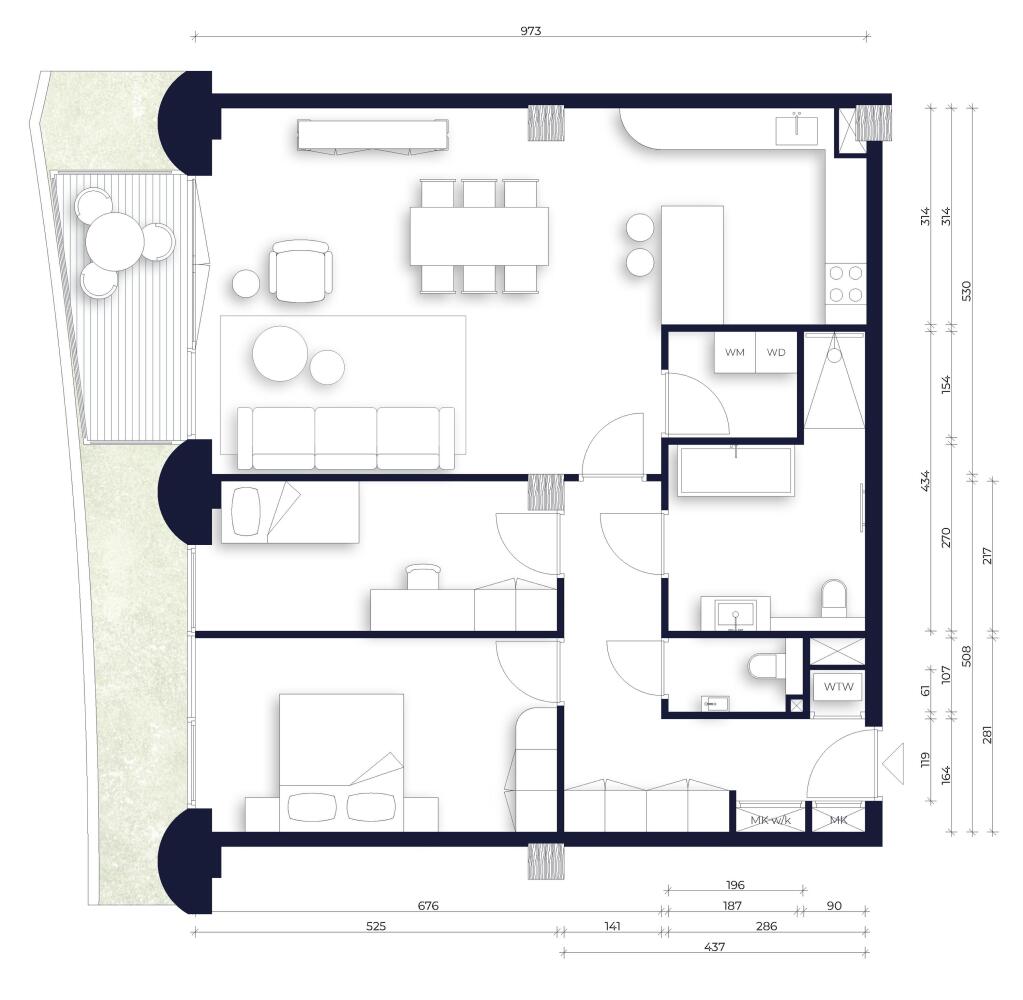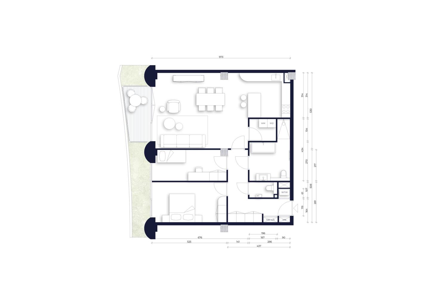 The entrance hall offers space for a full-height wardrobe. At the end of the hall, a generous living space opens up with a sheltered west-facing balcony. The corner-positioned kitchen allows for a kitchen island, while the space widens towards the dining and living areas. Along the façade are two comfortable bedrooms with ample daylight and views of the green zone next to the balcony. A complete bathroom with bathtub and a second guest bathroom complete the apartment.