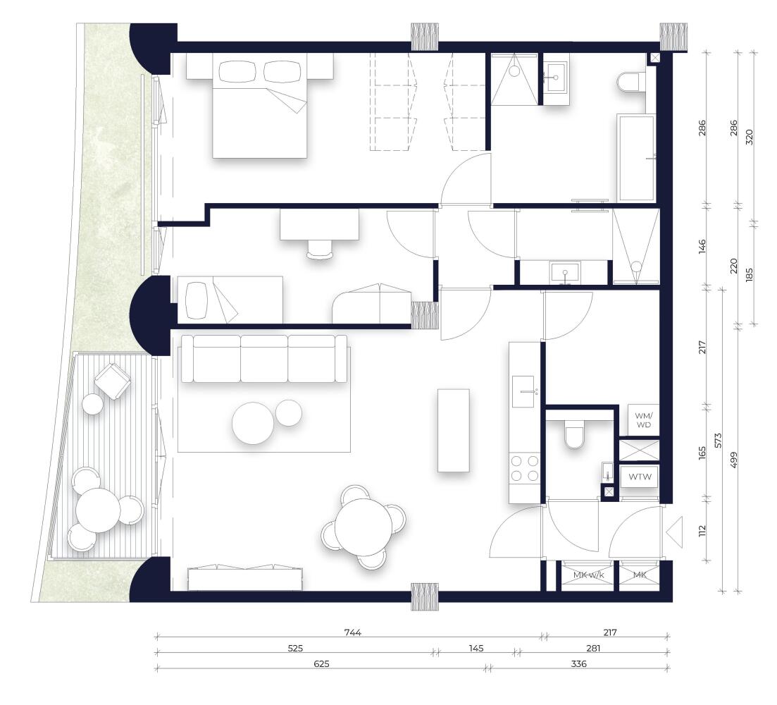 A comfortable and future-proof apartment with a thoughtful layout and a light, open atmosphere. From the hallway, you enter the living space with kitchen, dining area and lounge, all connected to the balcony. The kitchen balances function and design, with space for a kitchen island and practical storage behind it. The private area features a generous main bedroom with en-suite bathroom, suitable for flexible layouts and optionally a walk-in closet. A second bedroom and an additional bathroom complete the home. Both bedrooms border the green zone beside the balcony