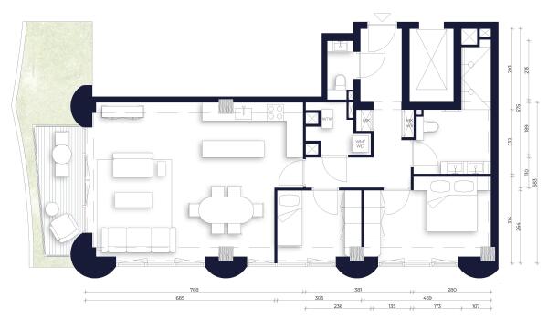 A comfortable apartment with a calm, refined character, located on the 2nd floor. The generous hallway leads into a bright living space where cooking, dining and relaxing come together around the kitchen. The apartment features one large and one smaller bedroom, both with ample daylight. A spacious bathroom with a shower set in an intimate niche completes this contemporary home.