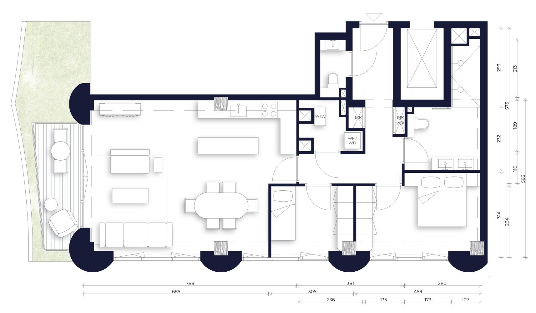 Ceci has been developed with ambitious sustainability goals. High insulation values, triple glazing, integrated solar panels and an innovative construction method using timber and recycled concrete minimise energy consumption while maximising living comfort. The result is an A+++ energy label. Underfloor heating and cooling provide a stable and comfortable indoor climate throughout the year. Triple glazing not only offers excellent insulation, but also effective sound reduction.