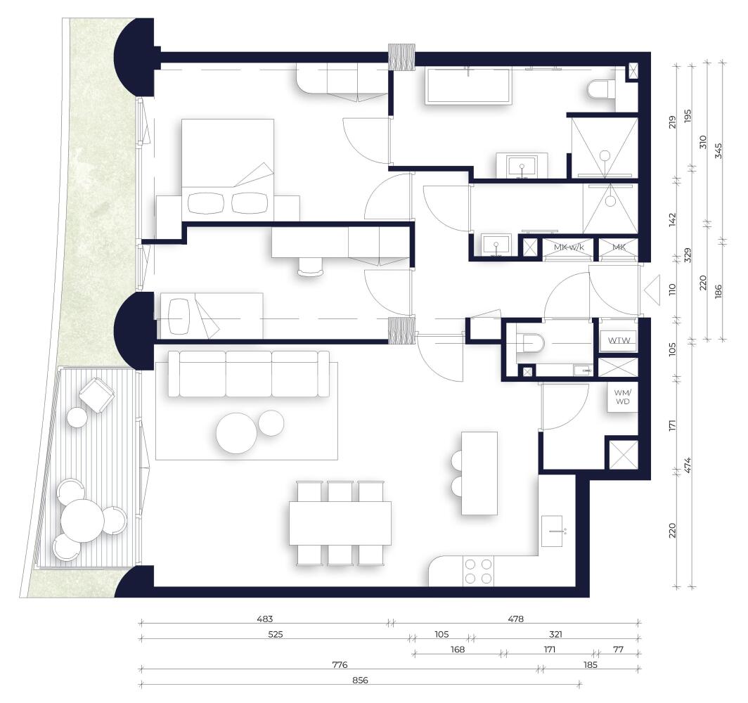 A contemporary apartment with a clear layout and a strong connection between indoors and outdoors. You enter directly into the heart of the home. To the left, the living area opens up with the kitchen, dining space and lounge, all connected to the balcony outside. In the kitchen, functionality and aesthetics go hand in hand, with space for a kitchen island and convenient storage behind the kitchen. To the right, the private area unfolds with two comfortable bedrooms and two bathrooms. Both bedrooms border the green zone next to the balcony. The main bedroom features an en-suite bathroom with a bathtub.