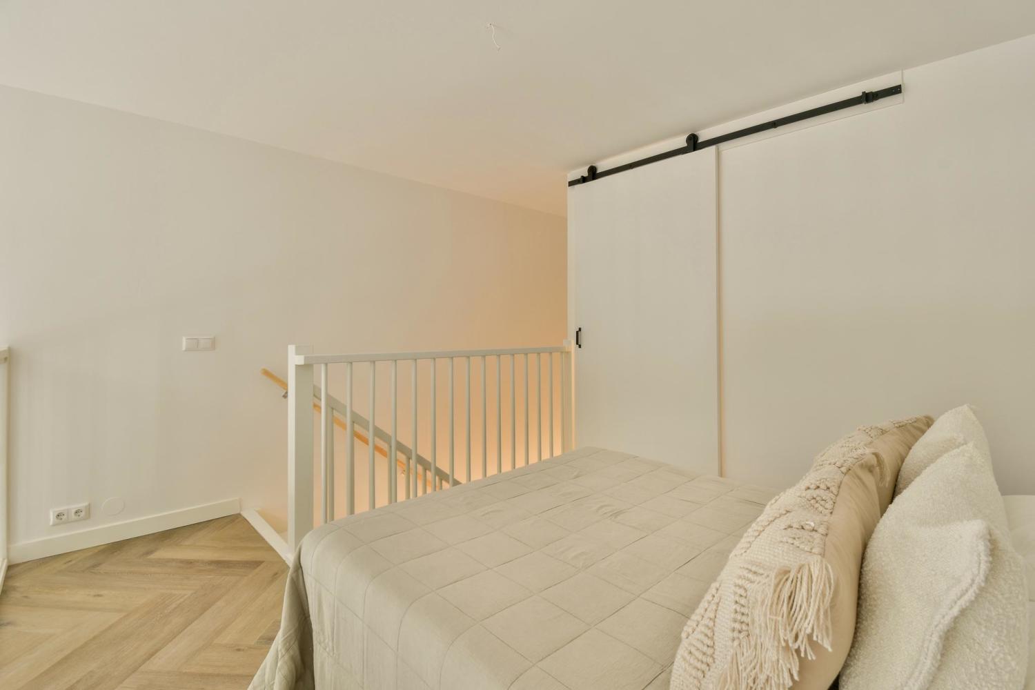Eigen entree via toegangsbruggetje; living met open keuken; toilet; technische ruimte met opstelling wasmachine; open slaapkamer op de mezzanine met aangrenzend de badkamer inclusief wastafel en inloopdouche.
