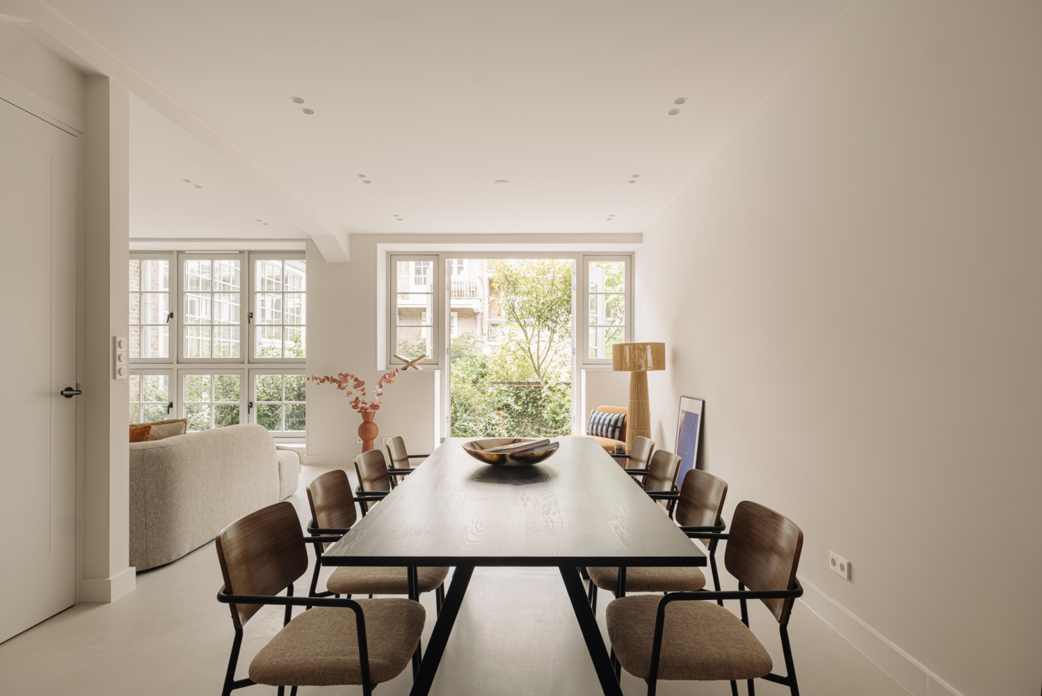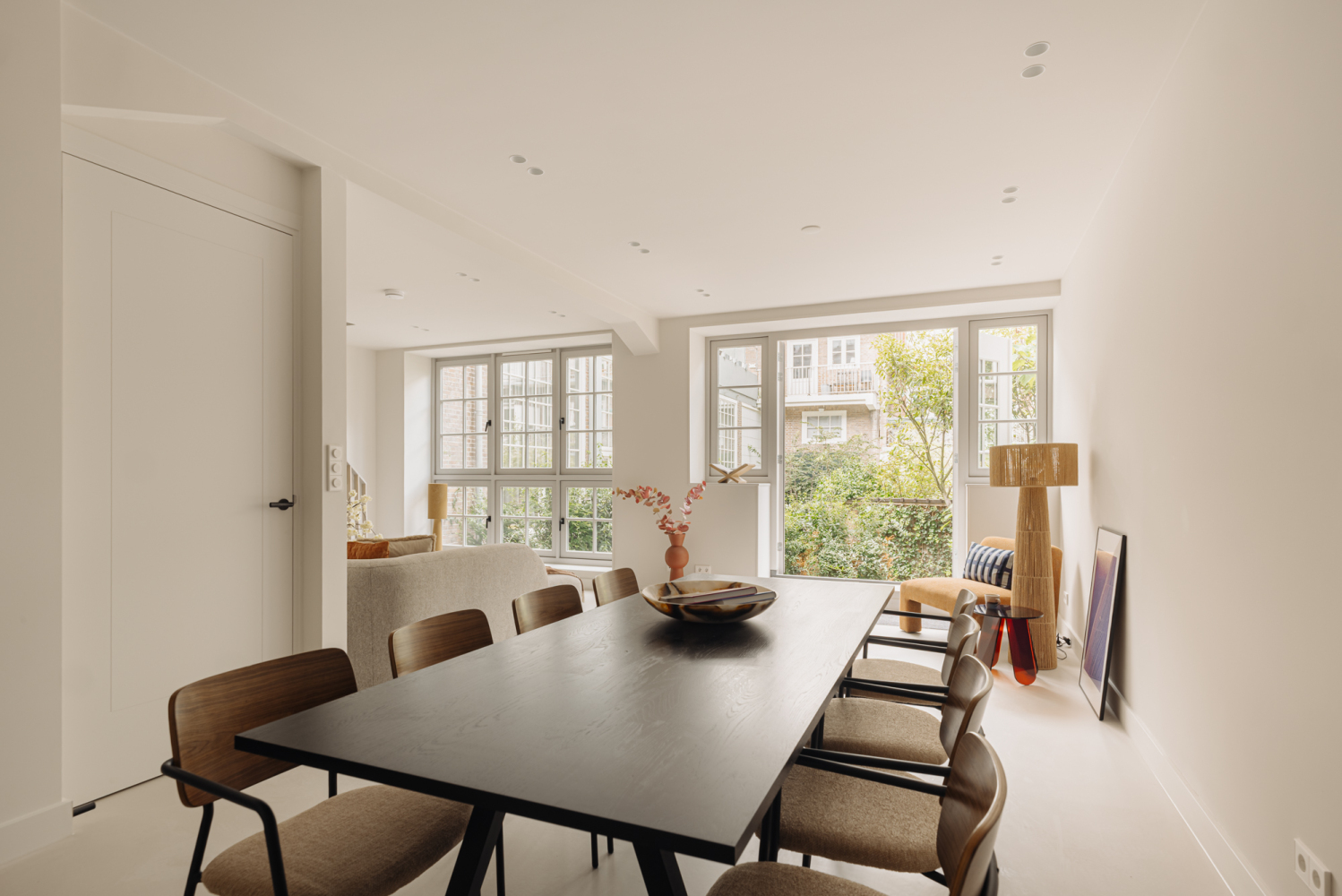 Een licht familiehuis van circa 134 m². De woning is verdeeld over vier woonlagen met drie slaapkamers, een ruim souterrain en een fijne tuin. De woning heeft een entree met gastentoilet en voldoende bergruimte. Op de begane grond is een licht woonvertrek met keuken en woongedeelte. De royale raampartijen aan de tuinzijde zorgen voor natuurlijke lichtinval in de ruimte. De openslaande deuren bieden toegang tot het terras en de tuin. Met een oppervlakte van circa 41 m² biedt de tuin volop ruimte om te spelen en te ontspannen. Binnen en buiten vloeien hier naadloos in elkaar over. De woning is voorzien van aansluitingen voor een keuken. Studio Piet Boon heeft een verfijnd ontwerp gemaakt voor een luxe keuken. De fraai gedetailleerde eiken trap vormt een architectonisch element in de ruimte en leidt naar de eerste verdieping. Op de eerste verdieping bevindt zich de eerste slaapkamer. De grote kamer met vide en een vrije hoogte van circa 5 meter, zorgen voor een ruimtelijk effect en een prachtige lichtinval. De badkamer, gelegen aan de gang, is voorzien van een wastafel met meubel, inloopdouche, toilet en voldoende opbergruimte. De badkamer is ook ontworpen door Piet Boon en voorzien van luxe tegels en kranen. Op de bovenste verdieping is een ruime tweede slaapkamer. Een daklicht zorgt hier voor extra daglicht. Het royale souterrain biedt ruimte voor een derde slaapkamer of werkkamer en beschikt over een eigen badkamer met loopdouche, toilet en een wastafel met meubel. De hal en berging op deze verdieping zorgen voor extra opbergruimte.