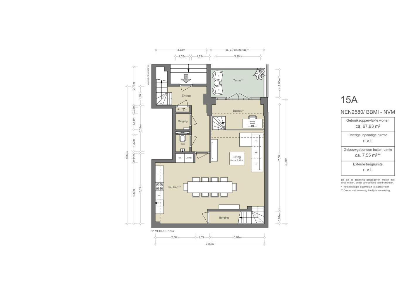 Wonen in een ruim appartement met drie slaapkamers en twee terrassen op het zuidwesten. De hal heeft een berging, wasruimte en toilet. Het middelpunt van de woning is het woonvertrek met een fraaie vide met grote hoogte en bordes naar het eerste terras. De ruimte biedt plek aan een keukengedeelte met voldoende plaats voor een grote eettafel. De woning is voorzien van aansluitingen voor een keuken. Studio Piet Boon heeft een fraai ontwerp gemaakt voor een luxe keuken. Het zitgedeelte is royaal en door de vide met hoge plafond prettig licht. Het terras van 7 m² is heeft middag en avond zon. Een fraai gedetailleerde eikentrap maakt onderdeel van de ruimte en vormt de verbinding naar één hoog. Op de eerste verdieping zijn twee ruime slaapkamers gelegen, elk met een eigen badkamer. De badkamers zijn voorzien van een wastafel met meubel, inloopdouche en opbergkast. De badkamers zijn ontworpen door Piet Boon en voorzien van luxe tegels en kranen van Piet Boon. Via een tweede trap is een derde slaapkamer te bereiken. De kamer heeft een eigen terras op het westen. Door de grote raampartijen en hoge plafonds is de kamer uiterste geschikt als werkkamer.