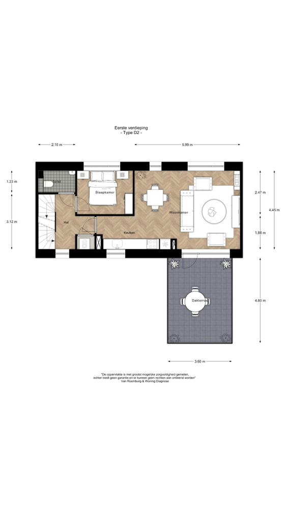 De verkoopinformatie is met grote zorgvuldigheid samengesteld doch voor de juistheid van de inhoud kunnen wij niet instaan en er kunnen derhalve geen rechten aan worden ontleend. De inhoud is puur informatief en mag niet worden beschouwd als een aanbod. Daar waar gesproken wordt over inhoud, oppervlakten of afmetingen moeten deze worden beschouwd als indicatief en als circa maten. Aangezien het nieuwbouw betreft, zijn de opgegeven m2 niet conform de Meetinstructie Gebruiksoppervlakte woningen van de NVM, maar zijn conform opgave architect. U dient als koper zelfonderzoek te verrichten naar zaken die voor u van belang zijn. Wij raden u in dat verband aan uw eigen (NVM-)makelaar in te schakelen.