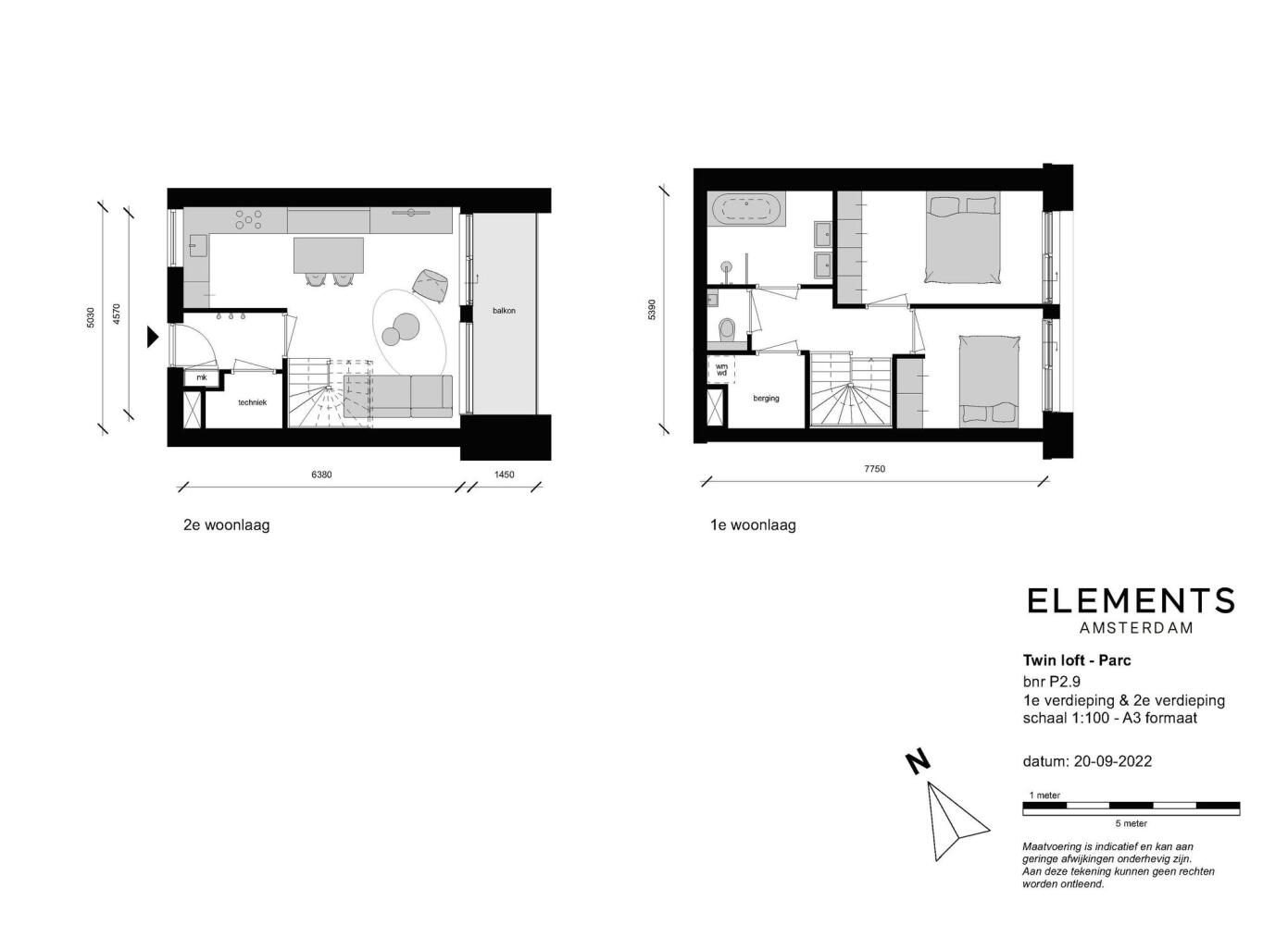 Op de eerste en tweede verdieping van Elements wordt Twin Loft P2.9 gerealiseerd, met een woonoppervlak van circa 74 m² en een balkon van circa 7 m². De entree bevindt zich aan de gemeenschappelijke binnentuin, een groene en rustige plek die direct bij thuiskomst een gevoel van ontspanning geeft. Vanuit de hal, waar ook de techniekruimte is gesitueerd, loopt de route door naar de lichte living met hoge ramen en een schuifpui naar het balkon. De keuken is ontworpen door Leicht Kitchens en uitgerust met hoogwaardige voorzieningen, waaronder een Quooker-kraan en een inductiekookplaat met geïntegreerde afzuiging. Het ontwerp kan worden aangepast naar persoonlijke voorkeur, met ruimte voor eigen materiaal- en kleurkeuze of slimme gebruiksoplossingen. Een verdieping lager liggen twee slaapkamers aan de oostzijde van het gebouw. Beide kamers zijn voorzien van schuifpuien, waardoor de ochtendzon rijkelijk binnenvalt. De badkamer wordt afgewerkt met zandkleurige matte tegels in groot formaat, gecombineerd met deels strak gestucte wanden voor een eigentijdse uitstraling. Hier bevinden zich een inloopdouche, ligbad en dubbele wastafel. Het separate toilet en de berging liggen eveneens op deze etage.