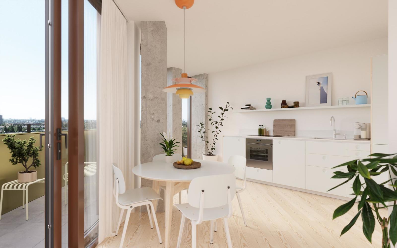 This spacious Sky Twin Loft is on the 15th and 16th floors of Elements and has two bedrooms. Huge windows in the living room allow a wealth of daylight into the apartment. The balcony spans the entire width of the apartment and is perfect for the afternoon and evening sun. The apartment overlooks the Duivendrechtsevaart canal, the River Amstel, and the open green spaces nearby.