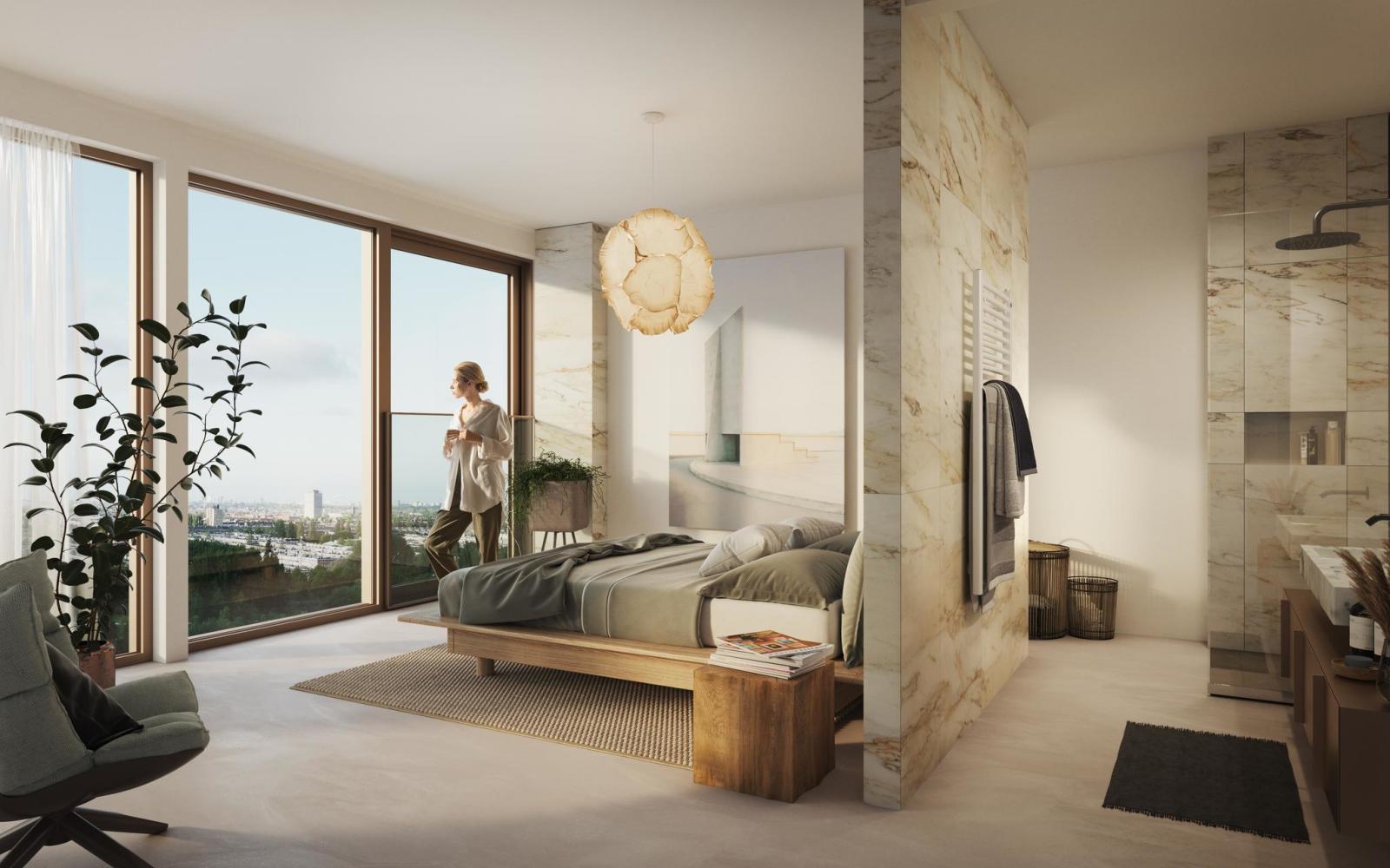 Deze royale Sky Twin Loft ligt op de 15e en 16e verdieping van Elements. Deze zogenaamde doorzonloft heeft grote raampartijen aan de slaapkamerzijde met uitzicht over de Amstel en de skyline van Amsterdam, dat ieder moment van de dag weer anders is. De loft heeft 3 slaapkamers. Het balkon over de volle breedte van de woning heeft een perfecte zonligging, waardoor je de hele dag zon hebt.