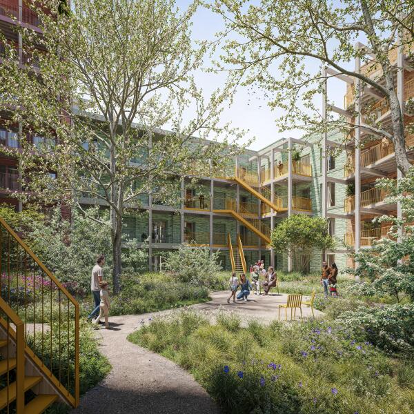 In Hibi geniet je niet alleen in je privé-buitenruimte van het zonnetje, maar kan je er ook voor kiezen om je even te ontspannen in het groen van de binnentuin. De verrassing van HiBi is de grote groene gedeelde binnentuin: een weelderige oase vol bomen en planten. Vanuit je woning heb je prachtig zicht op het groen. Hier ontspannen bewoners, spelen kinderen en nestelen dieren op ruim 1250 m2 stadsnatuur. Hibi haalt de natuur letterlijk naar je achtertuin. De zachte overgangen, getrapte niveaus en kleine waterpartijen geven een mooie speelse sfeer aan de tuin. Hier doe je samen leuke dingen, zoals sporten, barbecueën of tuinieren. Echt een plek voor rust en ontspanning.