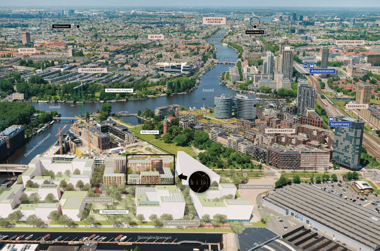 Hibi komt in het prachtige Amstelkwartier. Amstelkwartier ligt aan de bocht van de Amstel in Amsterdam Oost. De monumentale panden van de voormalige Zuidergasfabriek en de historische watertoren in het Bella Vistapark geven sfeer aan dit gebied. Maar vergeet ook het gezellige Amstelstrand niet, waar het zomers heerlijk toeven is aan de waterkant. Het Amstelkwartier is nu al een dynamische plek met een leuke mix wonen, leuke hotspots en recreatiemogelijkheden. Inclusief voorzieningen voor sport, onderwijs, horeca en winkelen. En een grote supermarkt komt zelfs op de begane grond van Hibi, hoe makkelijk is dat!