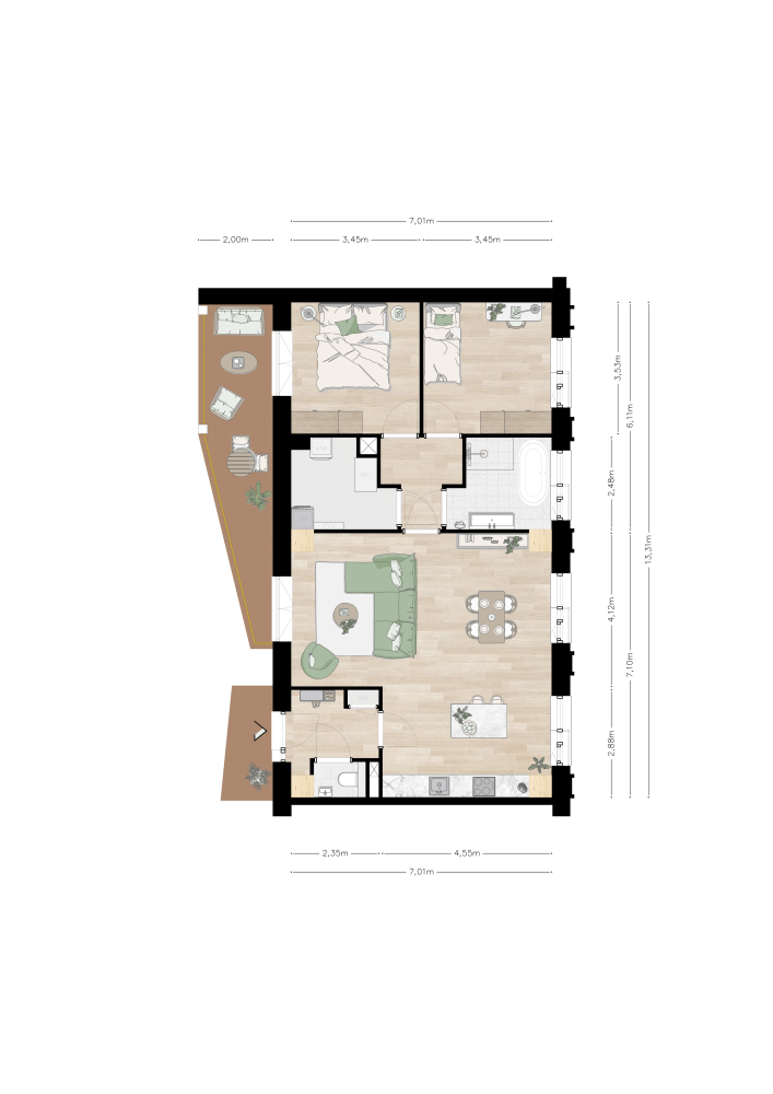 Ook GURiiN type C komt op alle vier de verdiepingen één keer voor. Dit is een 3-kamerappartement en biedt met 94 m2 alles wat je nodig hebt. Wat voor een appartement vrij uniek is, is dat dit appartement een 'doorzon woonkamer' heeft. Hoe fijn is het om aan twee zijden van lichtinval te profiteren? Ramen aan de voorzijde en aan de achterzijde openslaande deuren die uitkomen op de Azobé-houten galerij van waar je uitkijkt over de mooie groene binnentuin.