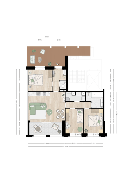 Dit appartement beschikt verder over drie slaap/werkkamers, badkamer, toilet en was-/installatieruimte. Bekijk hier de sfeerplattegrond in groter formaat. Voor GURiiN - type A zijn er twee indelingsvarianten: eentje met een grotere woonkamer twee slaapkamers & eentje met een extra slaapkamer.