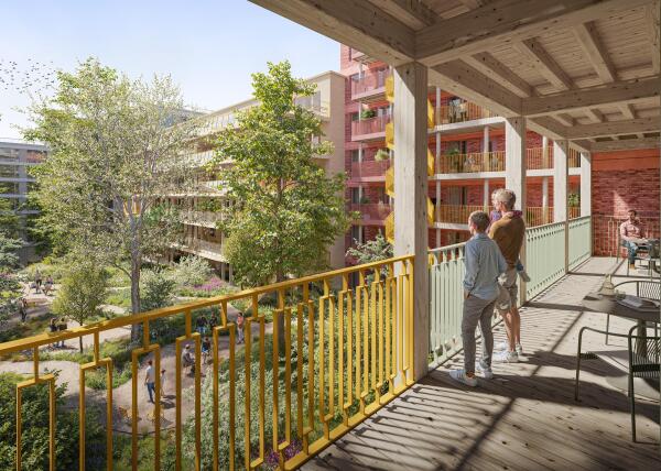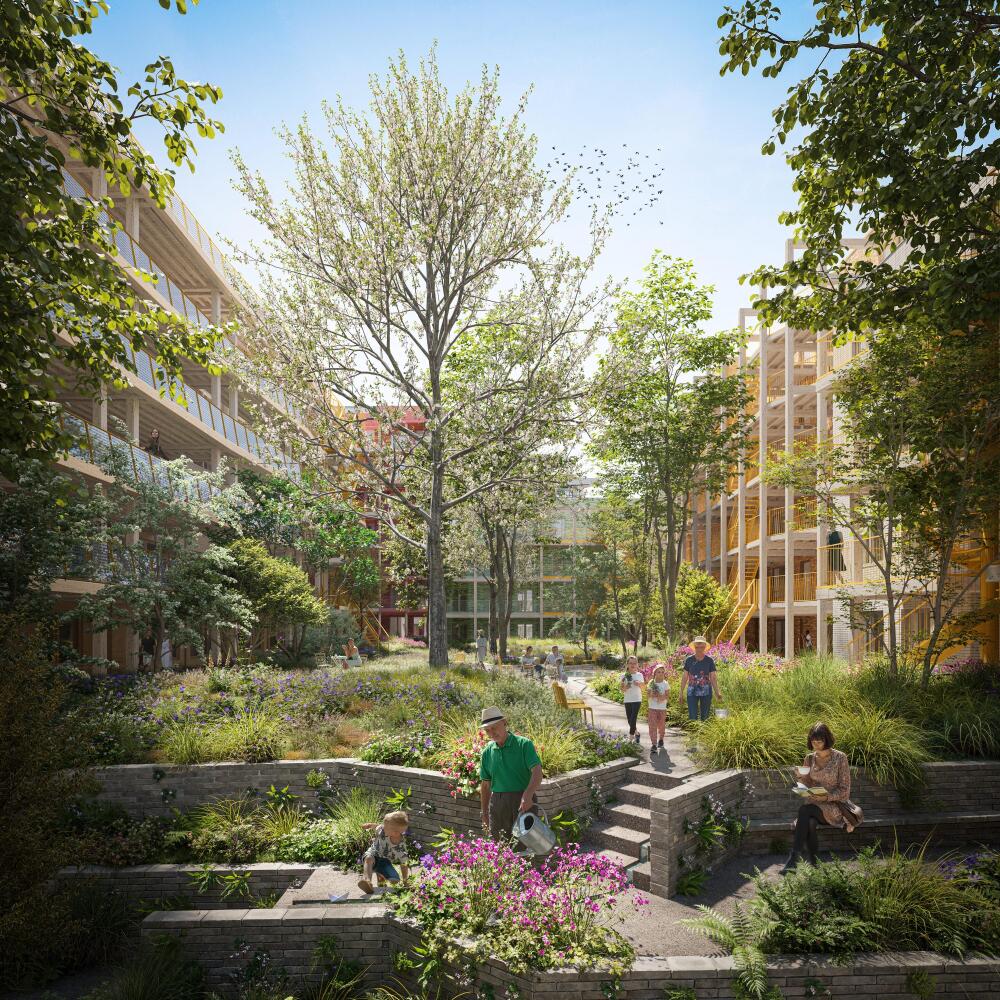 In Hibi geniet je niet alleen in je privé-buitenruimte van het zonnetje, maar kan je er ook voor kiezen om je even te ontspannen in het groen van de binnentuin. De verrassing van HiBi is de grote groene gedeelde binnentuin: een weelderige oase vol bomen en planten. Vanuit je woning heb je prachtig zicht op het groen. Hier ontspannen bewoners, spelen kinderen en nestelen dieren op ruim 1250 m2 stadsnatuur. Hibi haalt de natuur letterlijk naar je achtertuin. De zachte overgangen, getrapte niveaus en kleine waterpartijen geven een mooie speelse sfeer aan de tuin. Hier doe je samen leuke dingen, zoals sporten, barbecueën of tuinieren. Echt een plek voor rust en ontspanning.