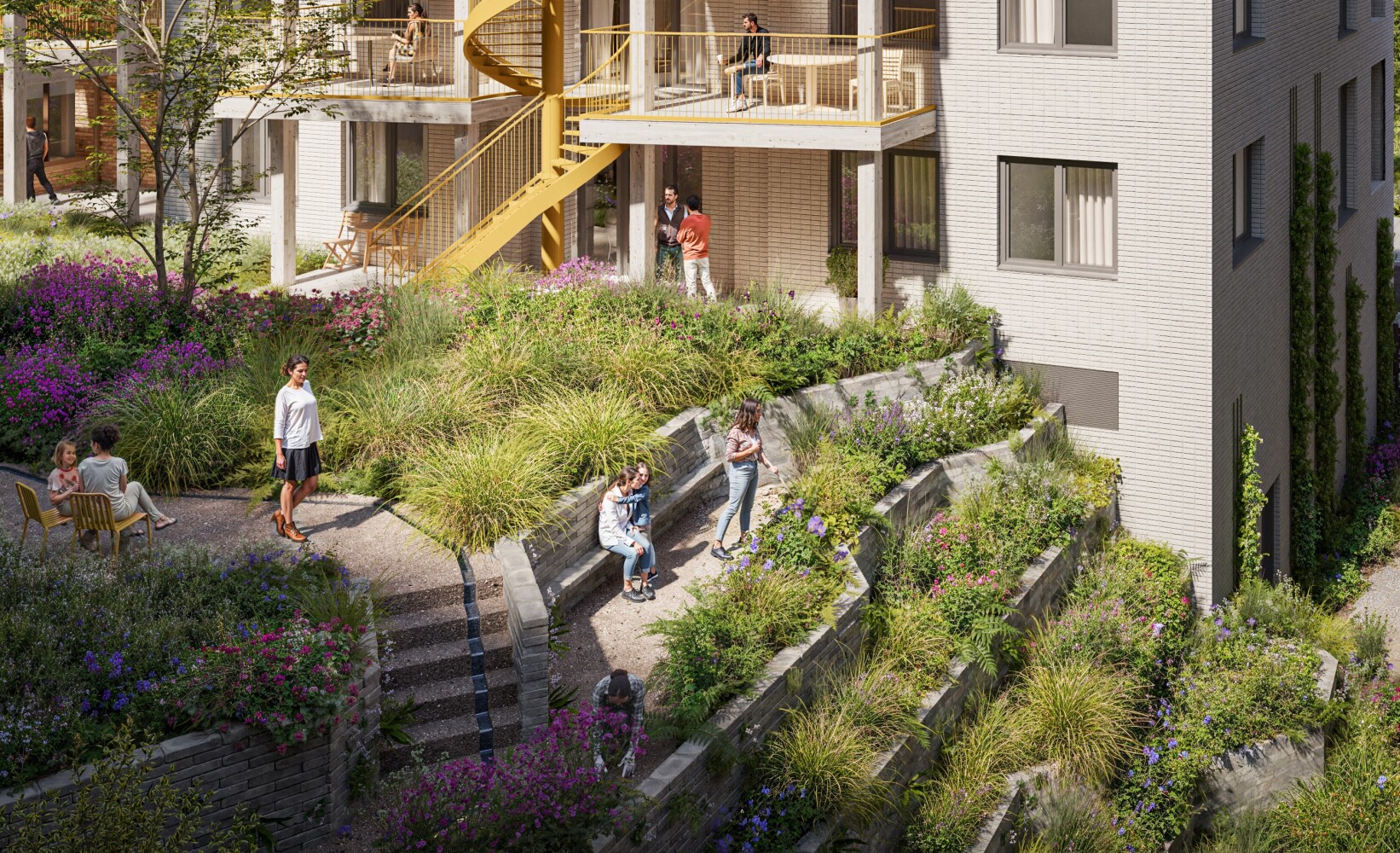 In Hibi geniet je niet alleen in je privé-buitenruimte van het zonnetje, maar kan je er ook voor kiezen om je even te ontspannen in het groen van de binnentuin. De verrassing van HiBi is de grote groene gedeelde binnentuin: een weelderige oase vol bomen en planten. Vanuit je woning heb je prachtig zicht op het groen. Hier ontspannen bewoners, spelen kinderen en nestelen dieren op ruim 1250 m2 stadsnatuur. Hibi haalt de natuur letterlijk naar je achtertuin. De zachte overgangen, getrapte niveaus en kleine waterpartijen geven een mooie speelse sfeer aan de tuin. Hier doe je samen leuke dingen, zoals sporten, barbecueën of tuinieren. Echt een plek voor rust en ontspanning.