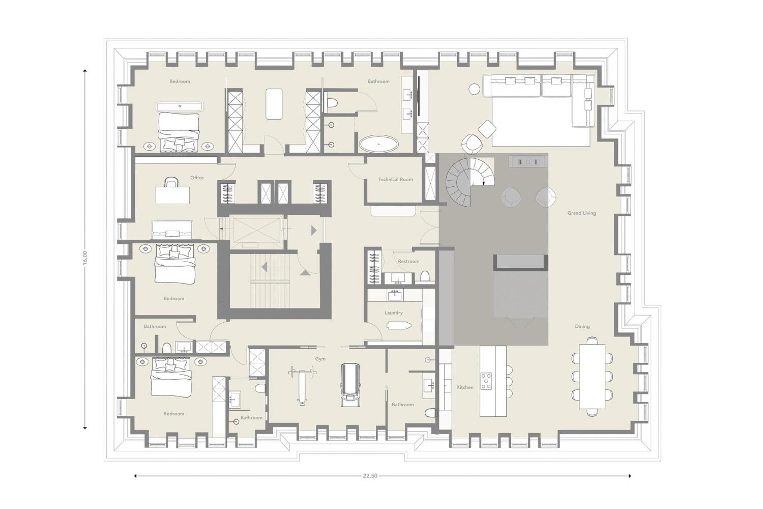 Kings/Lane Topfloors omvat twee 'one floors' en een penthouse, elk gesitueerd op één royale woonlaag. Penthouse No. 6 is een appartement van circa 388 m², dat de volledige vierde etage beslaat en beschikt over een riante entresol. Met deze indrukwekkende woonoppervlakte en de uitstraling van een kapverdieping, biedt dit penthouse een ongeëvenaarde woonbeleving.