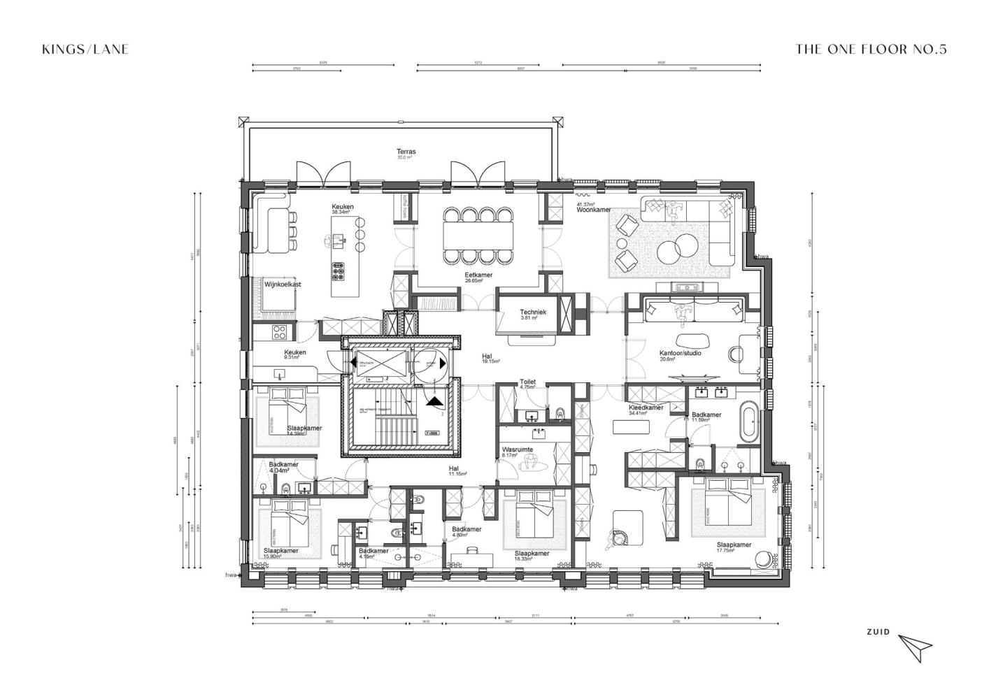 Het appartement is direct toegankelijk vanuit de lift. De interieurarchitecten van Framework maakten een ontwerp met aan de westzijde de ruimten van de woonkamer, eetkamer en leefkeuken. Dit appartement heeft vier ruim opgezette slaapkamers met ieder een eigen badkamer en een extra study of bibliotheek. Het terras dat grenst aan de woonkeuken en de eetkamer is vanuit beide vertrekken toegankelijk via de openslaande deuren. De lift heeft een tweede uitgang, als aparte toegang tot een beperkt gedeelte van de woning, bijvoorbeeld voor personeel. Kings/Lane biedt de vrijheid om een woning te creëren die perfect aansluit op uw wensen. Het is mogelijk om een geheel eigen indelingsontwerp te laten realiseren.
