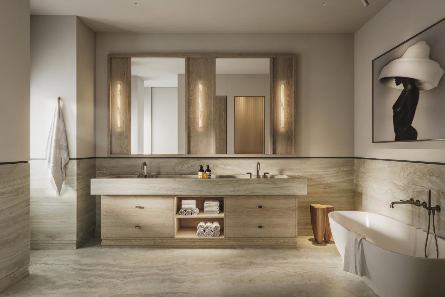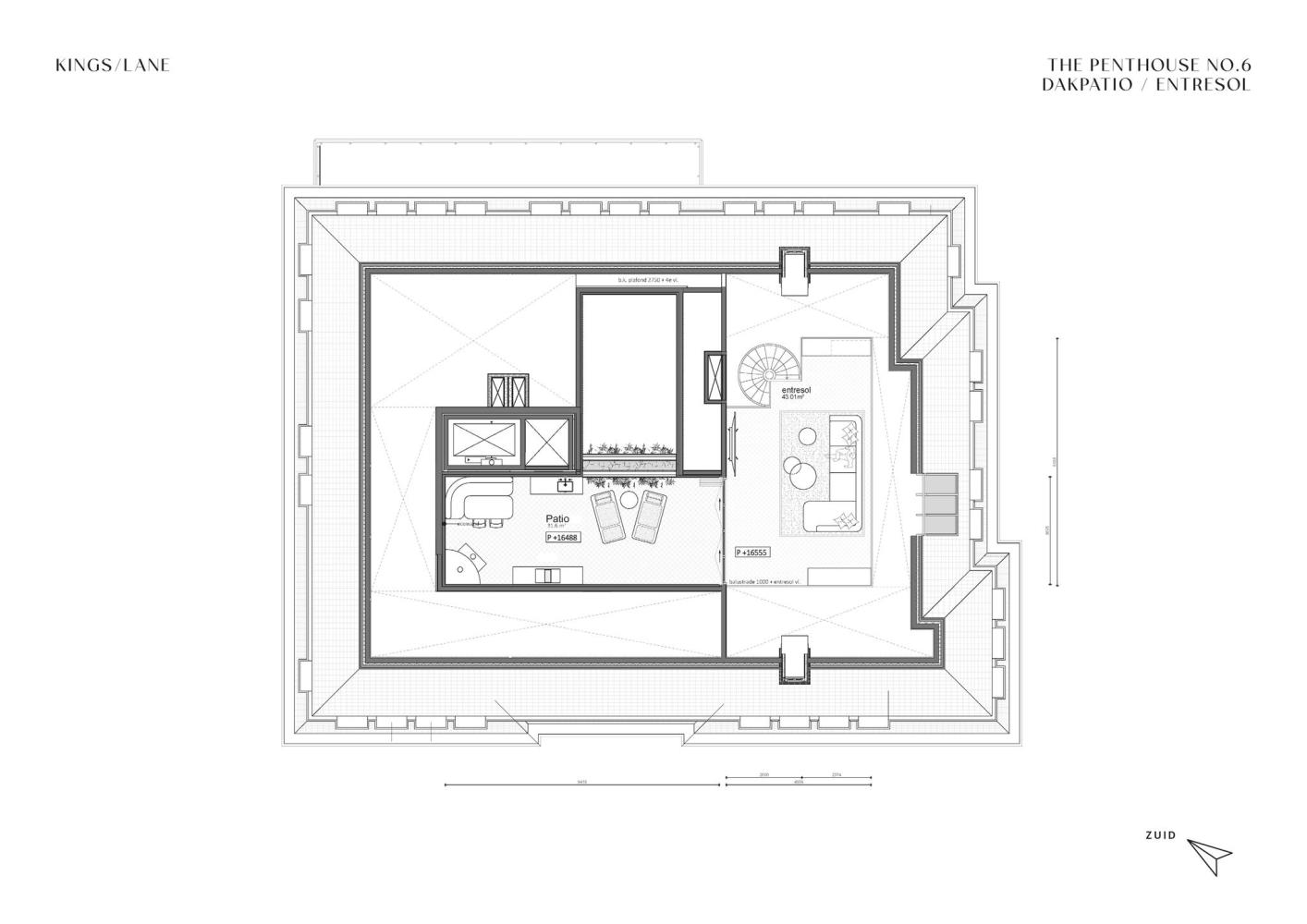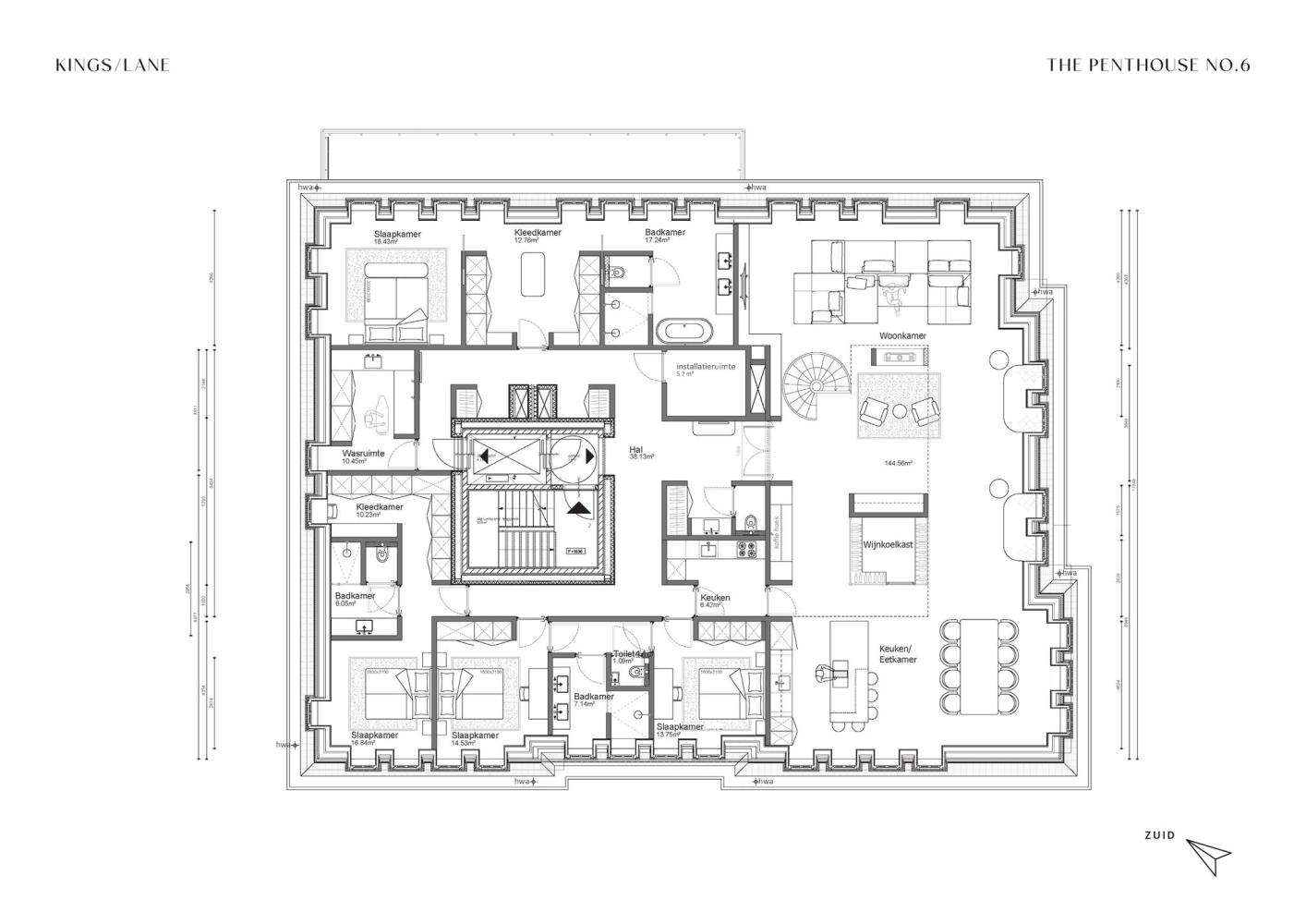 Het penthouse, op de vierde en vijfde etage, heeft een uitgebalanceerd ontwerp met een grote en hoge woonkamer en eetkamer. Framework ontwierp vier slaapkamers met eigen badkamers en veel kastruimte. Op de vijfde etage is een entresol van circa 43 m2 met toegang tot een heerlijke dakpatio. De patio biedt veel privacy door de verhoogde dakrand. In een gedeelte van de woon- en eetkamer is de nok zichtbaar met een hoogte van circa 5.40 meter. Onder de entresol is ruimte voor een sfeervolle zithoek bij de haard. Kings/Lane biedt de vrijheid om een woning te creëren die perfect aansluit op uw wensen. Het is mogelijk om een geheel eigen indelingsontwerp te laten realiseren.