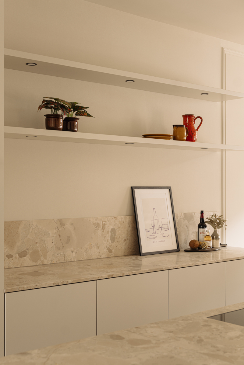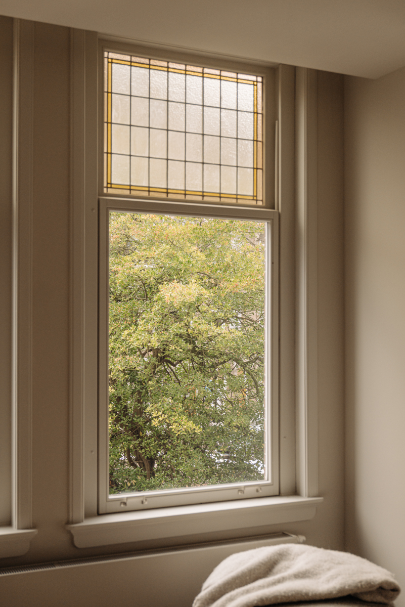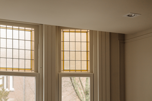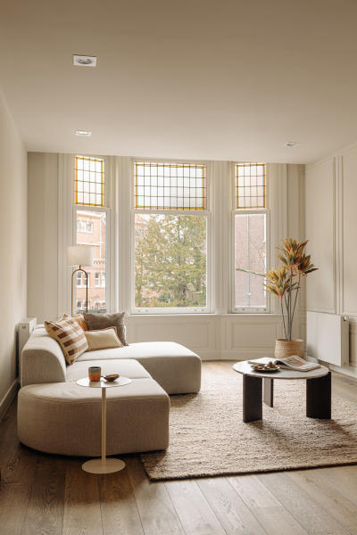 Toegang tot de woning via het monumentale trappenhuis of met de lift, die uitkomt in een privé-entree. Hier begint de ervaring: hoge glas-in-loodramen vangen het licht en benadrukken de statige sfeer van het gebouw. De woonverdieping strekt zich uit over de volle diepte van het huis. Aan de voorzijde ligt het zitgedeelte, waar de brede erker het ritme van de gevel doorbreekt en de ruimte overspoelt met licht. Vanuit hier kijk je uit over de lommerrijke Waldeck Pyrmontlaan.