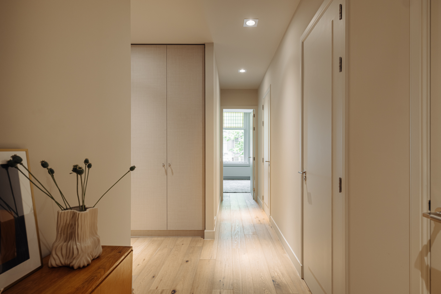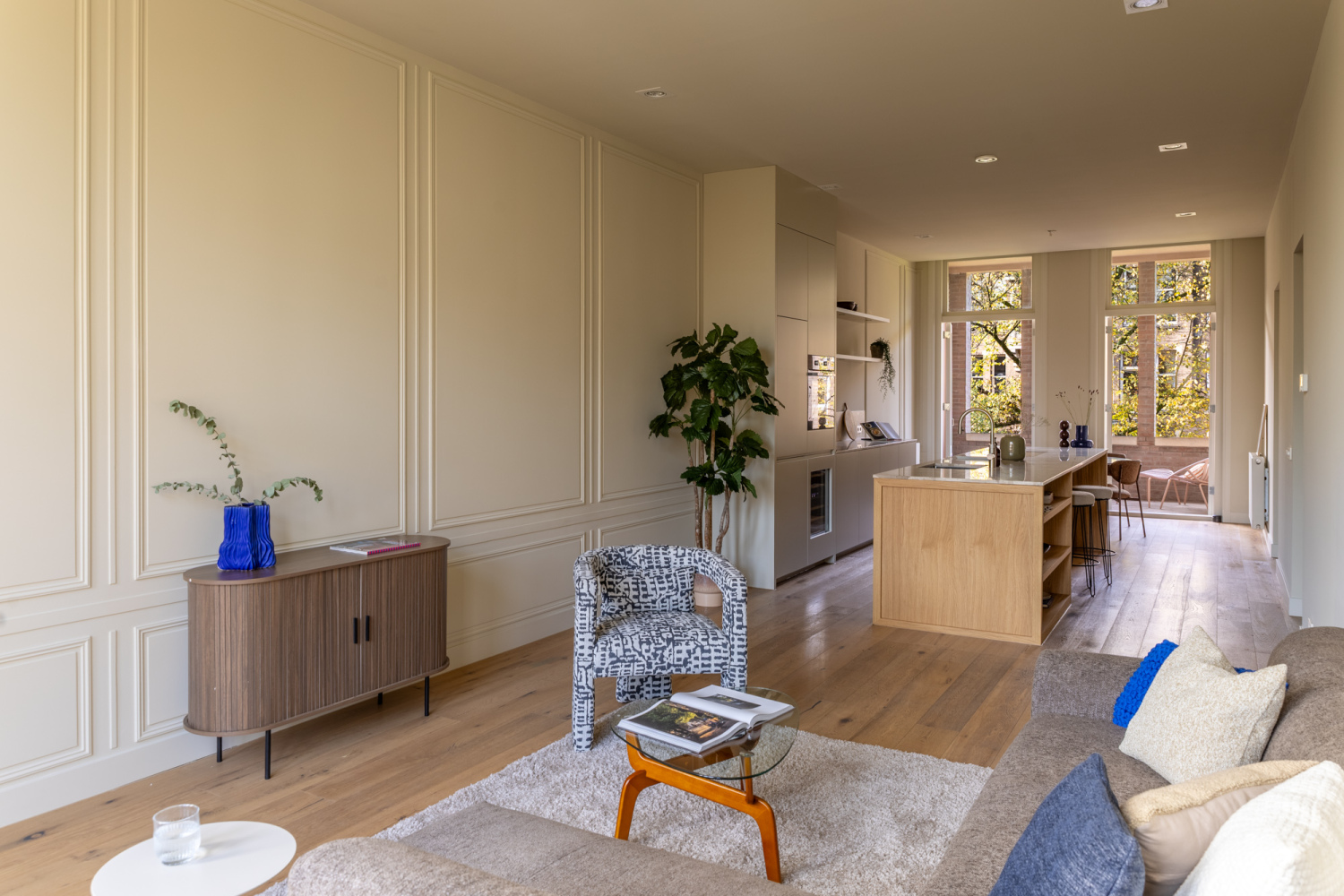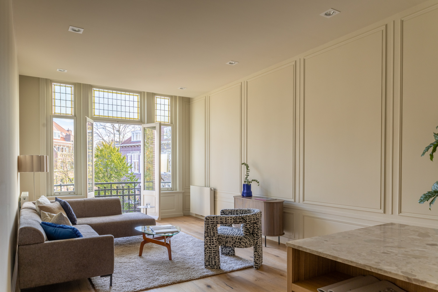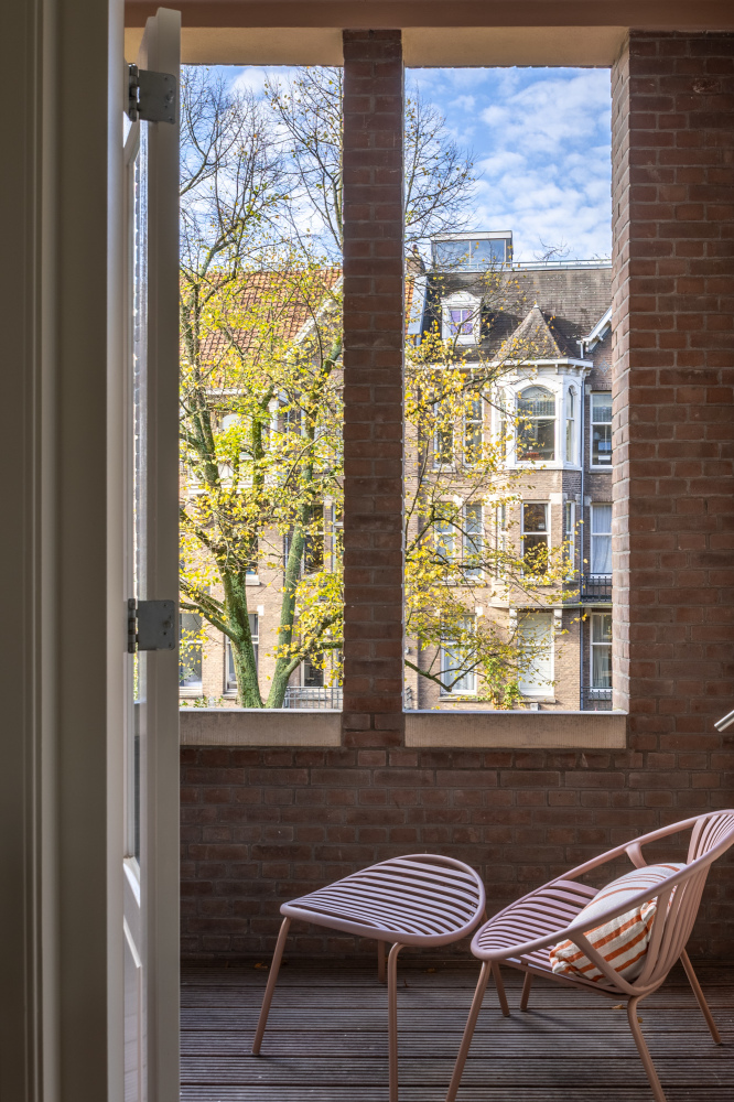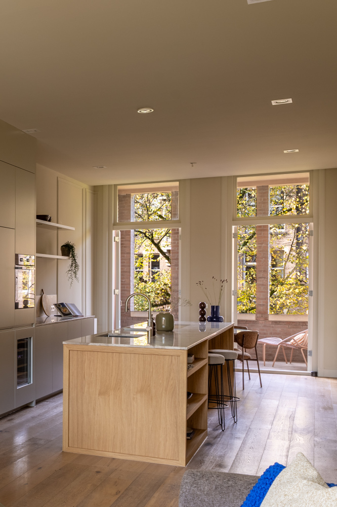 Toegang tot de woning via lift of het authentieke trappenhuis met glas-in-loodramen. De entreehal is royaal en licht, en vormt de opmaat tot een ruimtelijke woonverdieping die zich uitstrekt van voor naar achter. Aan de straatzijde ligt het zitgedeelte, met als blikvanger het balkon aan de voorzijde, een fijne plek om de seizoenen te ervaren, verscholen achter het groen. De eetkamer ligt aan de achterzijde en staat via openslaande deuren in verbinding met het zongerichte terras. De aangrenzende woonkeuken is voorzien van een maatwerk interieur, uitgevoerd in hout met een natuurstenen blad. Het kookeiland met barfunctie nodigt uit tot informeel samenzijn, terwijl de lengte en breedte van de ruimte zorgen voor lucht en licht. De hoogwaardige afwerking en het zorgvuldige lijnenspel maken deze woonlaag tot een ingetogen, maar uitgesproken geheel. Aan de achterzijde van de woning ligt de hoofdslaapkamer, ruim, stil en met grote ramen op het zuidwesten. Direct verbonden met deze kamer is een royale kleedruimte, voorbereid op een maatwerk inrichting. De ruimte is vrij indeelbaar en biedt volop mogelijkheden voor kastruimte. De badkamer ligt apart, centraal op de verdieping. Hier komen luxe en functionaliteit samen in een vrijstaand bad, een royale inloopdouche, dubbele wastafel en toilet. Aan de voorzijde ligt een tweede slaapkamer, ideaal als werkruimte of logeerkamer. Aan de gang is een tweede toilet en bergruimte met wasmachine aansluiting. De combinatie van licht, rust en heldere indeling maakt deze woonlaag tot een aangename privézone binnen het huis.