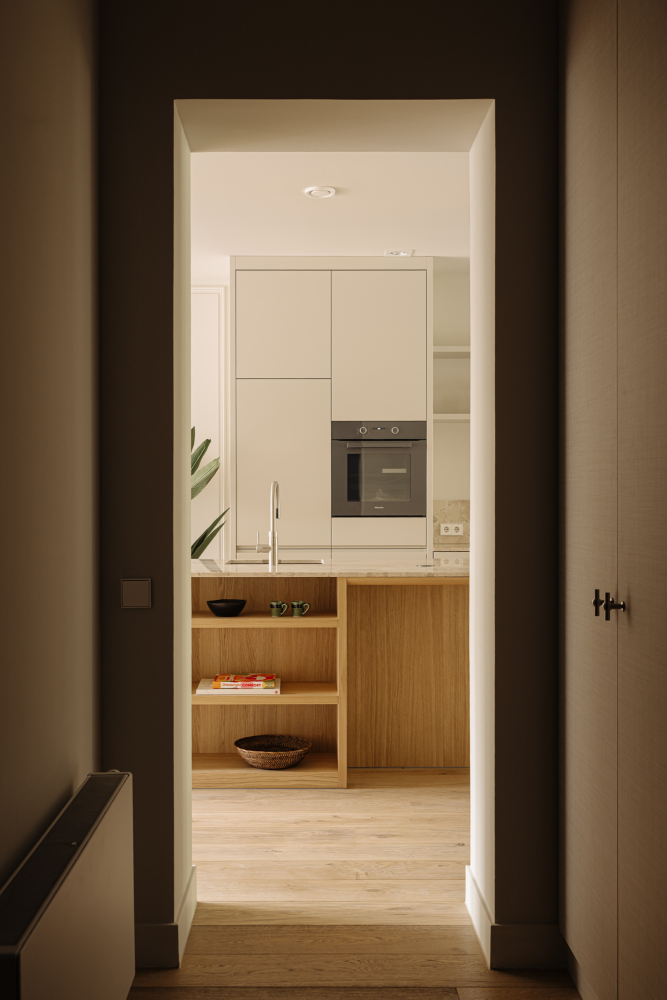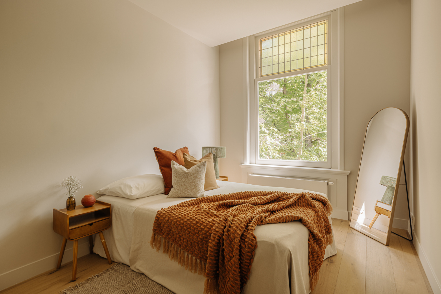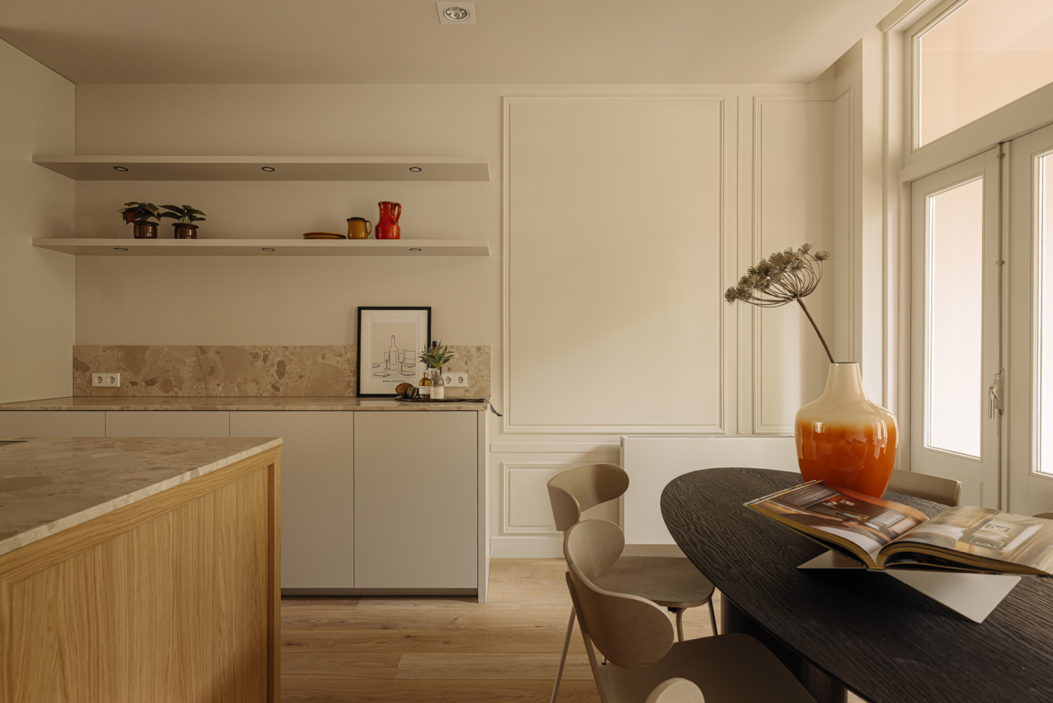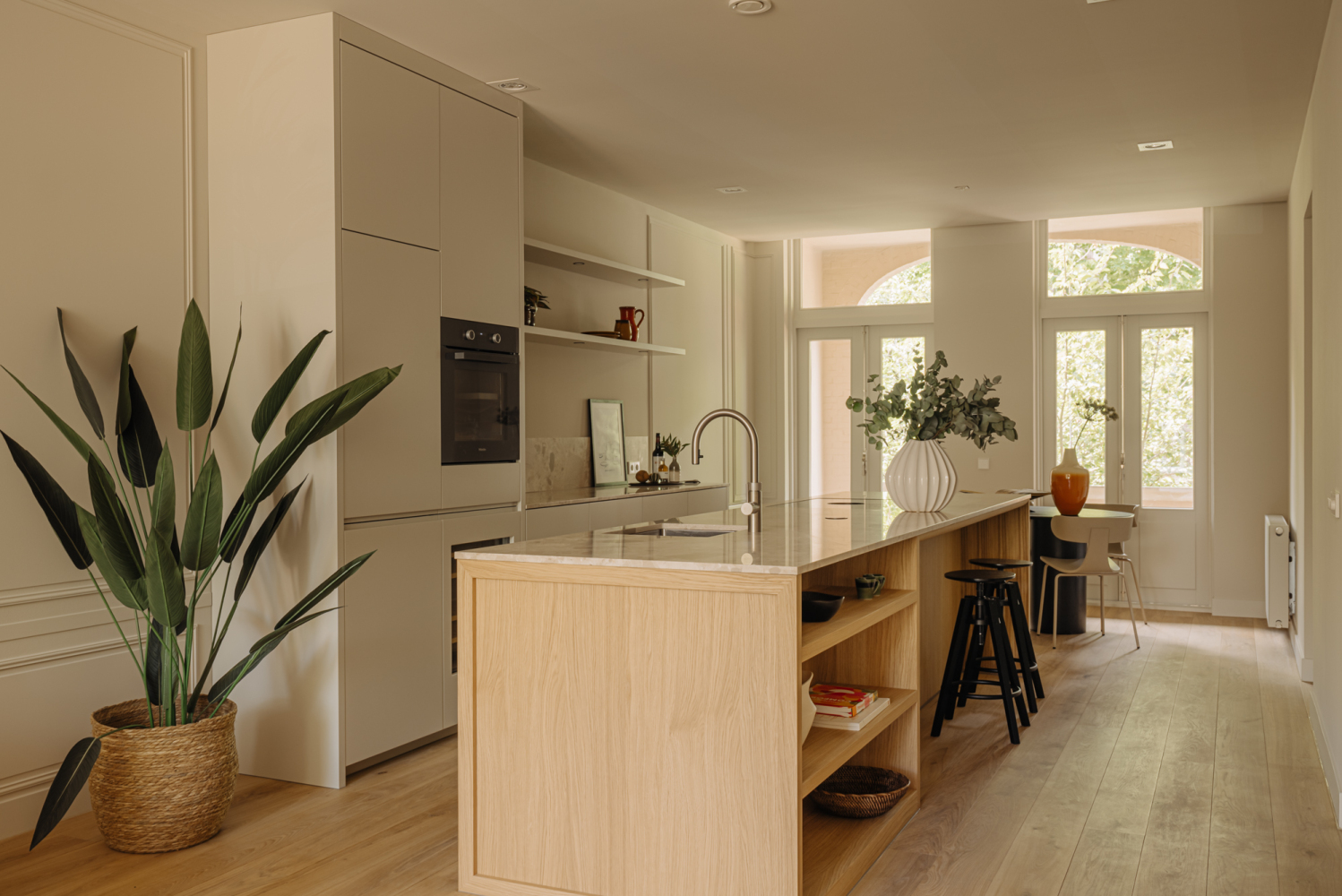 Toegang tot de woning via lift of het authentieke trappenhuis met glas-in-loodramen. De entreehal is royaal en licht, en vormt de opmaat tot een ruimtelijke woonverdieping die zich uitstrekt van voor naar achter. Aan de straatzijde ligt het zitgedeelte, met als blikvanger het balkon aan de voorzijde, een fijne plek om de seizoenen te ervaren, verscholen achter het groen. De eetkamer ligt aan de achterzijde en staat via openslaande deuren in verbinding met het zongerichte terras. De aangrenzende woonkeuken is voorzien van een maatwerk interieur, uitgevoerd in hout met een natuurstenen blad. Het kookeiland met barfunctie nodigt uit tot informeel samenzijn, terwijl de lengte en breedte van de ruimte zorgen voor lucht en licht. De hoogwaardige afwerking en het zorgvuldige lijnenspel maken deze woonlaag tot een ingetogen, maar uitgesproken geheel. Aan de achterzijde van de woning ligt de hoofdslaapkamer, ruim, stil en met grote ramen op het zuidwesten. Direct verbonden met deze kamer is een royale kleedruimte, voorbereid op een maatwerk inrichting. De ruimte is vrij indeelbaar en biedt volop mogelijkheden voor kastruimte. De badkamer ligt apart, centraal op de verdieping. Hier komen luxe en functionaliteit samen in een vrijstaand bad, een royale inloopdouche, dubbele wastafel en toilet. Aan de voorzijde ligt een tweede slaapkamer, ideaal als werkruimte of logeerkamer. Aan de gang is een tweede toilet en bergruimte met wasmachine aansluiting. De combinatie van licht, rust en heldere indeling maakt deze woonlaag tot een aangename privézone binnen het huis.