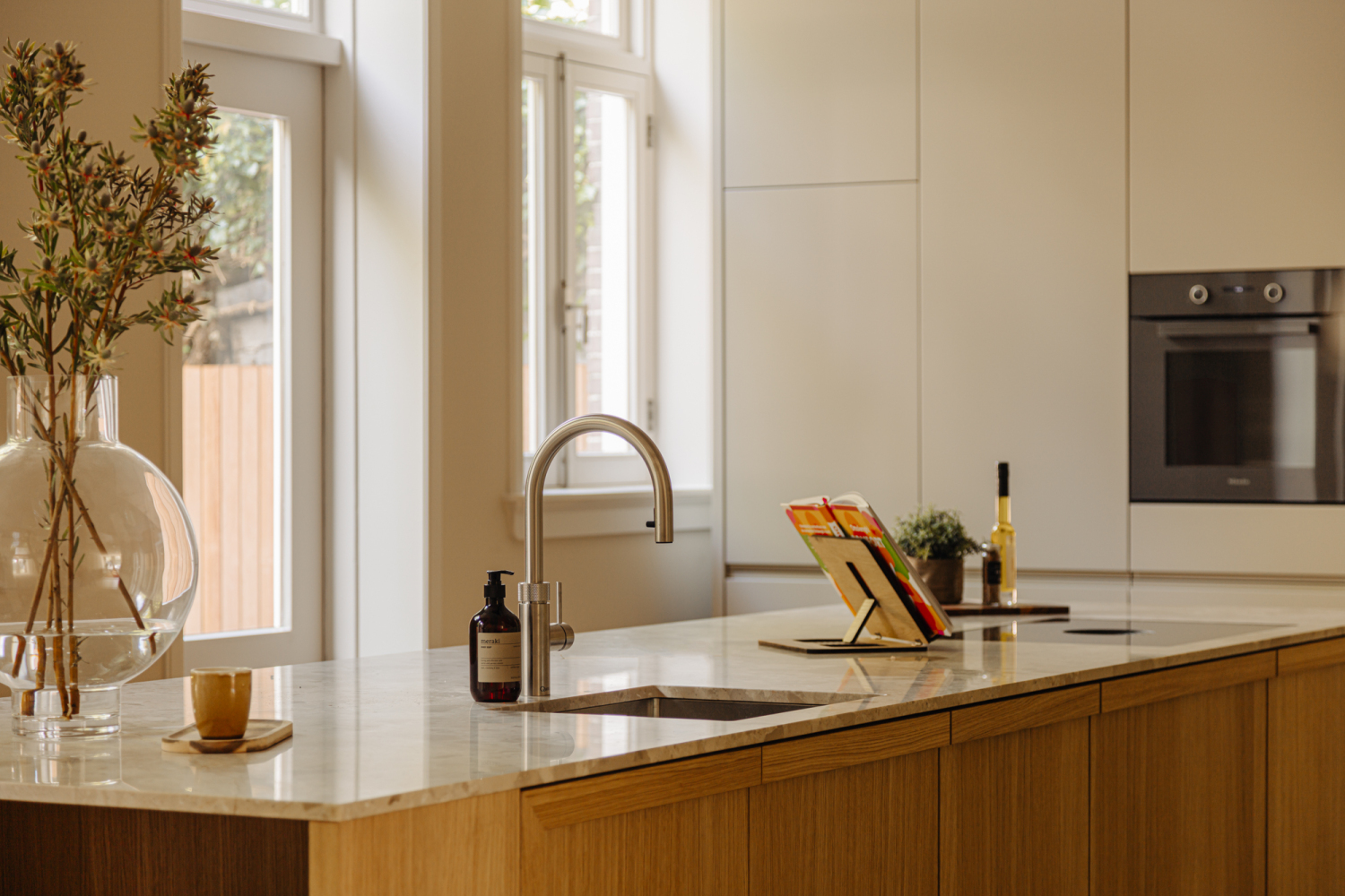 Entree op de begane grond in royale hal met trappenhuis, gastentoilet en berging. Licht woonvertrek met aan de voorzijde een ruim woongedeelte met 3,10 hoge plafonds en sfeervolle paneling. De grote ramen hebben zicht op voortuin en richting het park. Aan de achterzijde is het eetgedeelte met plek aan een grote eettafel. Openslaande deuren geven toegang tot de tuin, binnen en buiten lopen naadloos in elkaar over. Aansluitend aan het eetgedeelte is de woonkeuken, het middelpunt van het huis.is de woonkeuken. De maatwerk keuken is uitgevoerd in fraai hout en natuurstenen blad. De keuken is voorzien van inbouw apparatuur van oa Miele, Quooker en een wijnklimaatkast. Het eiland is voorzien van een bar gedeelte. De woonkeuken heeft een unieke breedte van ruim 9,30 meter, waardoor er prettig veel licht is. Op de begane grond is een goed voormaat slaapkamer met eigen badkamer. De kamer is ideaal als werkkamer of logeerkamer. De smaakvolle badkamer heeft een inloopdouche en luxe wastafel. In het souterrain zijn twee riante slaapkamers, eentje aan de voorzijde en eentje aan de achterzijde. De hoofdslaapkamer heeft en suite een ruime kleedkamer en aansluitend een luxe badkamer. De badkamer is voorzien van vrijstaand bad, inloopdouche, dubbele wastafel en toilet. Aan de gang is een derde badkamer, met inloopdouche.