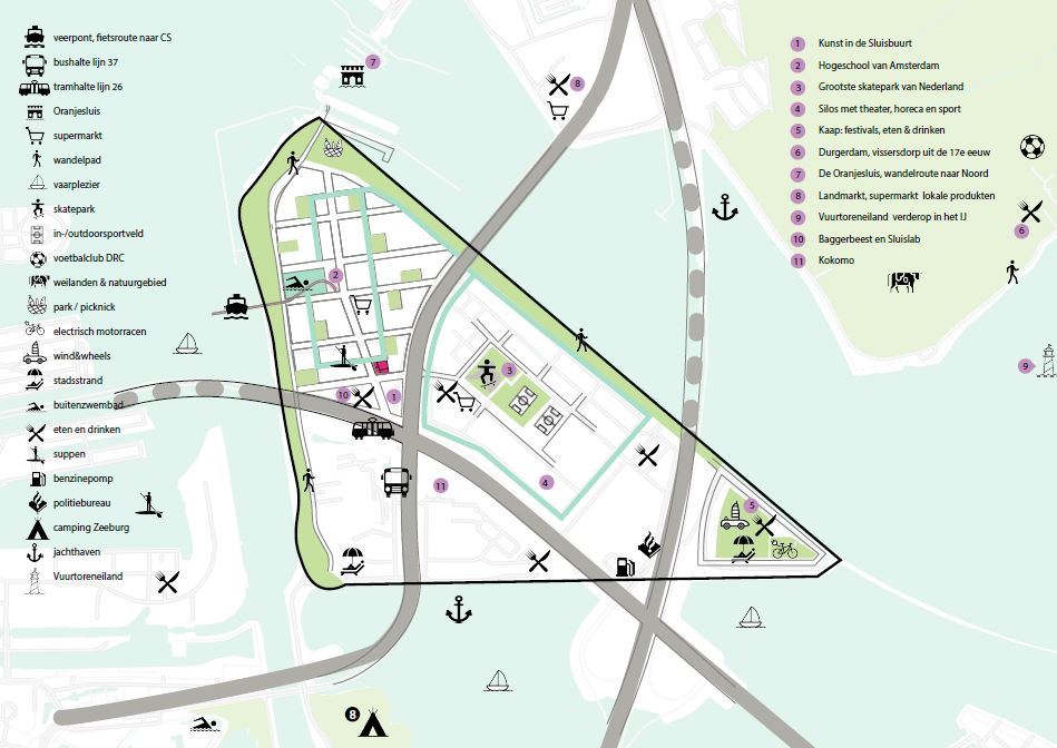 De Sluisbuurt ligt op de westelijke punt van Zeeburgereiland, een groen en waterrijk stadseiland binnen de ring van Amsterdam. Het eiland wordt helemaal omsloten door het water van het IJ, het Amsterdam-Rijnkanaal en het Binnen- en Buiten-IJ. De Sluisbuurt, een groene autoluwe stadswijk, is het meest stadse deel en ligt direct aan de Oranjesluizen en het Binnen-IJ. De skyline van de hoogbouw op de Sluisbuurt is straks tot ver buiten Amsterdam te zien. Niet voor niets was de werktitel ‘Vancouver aan ‘t IJ’. De meeste voorzieningen van het eiland zoals winkels en horeca zijn in de Sluisbuurt rondom het Waterplein en langs de hoofdstraat te vinden. Het Zeeburgerplein, bij de kruising Zuiderzeeweg-IJburglaan, wordt het nieuwe hart van het eiland. Langs die levendige hoofdstraat vind je The / Suites.