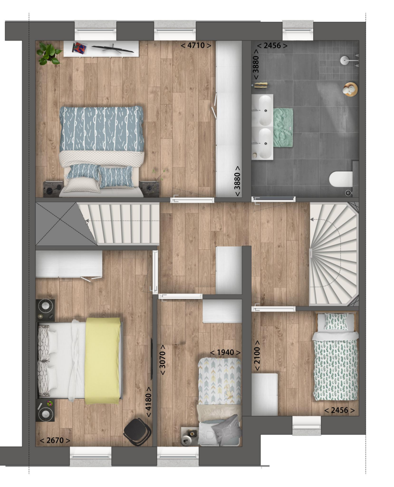 De stadswoningen die het plan aan de zijde van de Hendrik de Ruiterstraat omsluiten, zijn uitgevoerd in verschillende formaten en in diverse tinten wasserstrich metselwerk. Een spannende mix van verschillende types door elkaar heen. U heeft bij dit specifieke woningtype de keuze uit een woning met een plat dak, waar u profiteert van de volledige verdiepings- hoogte of een woning met een extra zolderverdieping hier bovenop. Daarnaast zijn er woningen met een gedeeltelijke tweede verdieping. Net wat u wil!