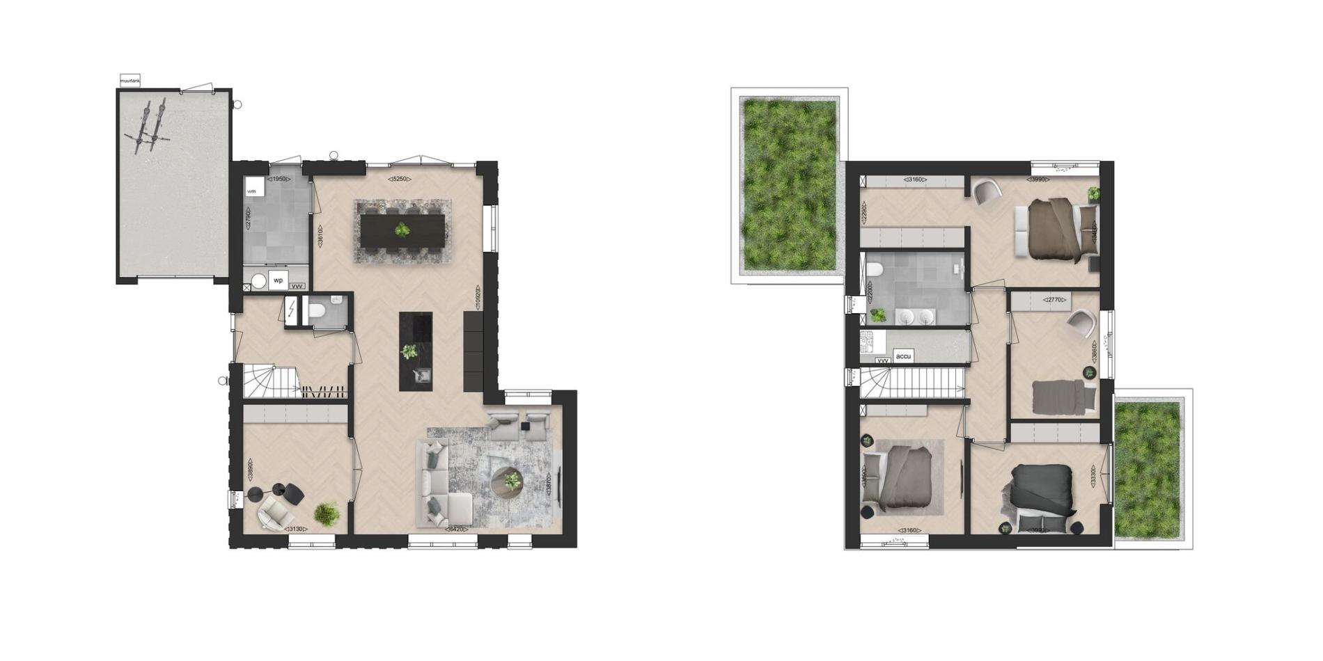 1e Verdieping: Via de trap in de hal bereik je de eerste verdieping, waar je uitkomt op een ruime overloop. Deze ruimte biedt toegang tot de vier slaapkamers, waarvan één slaapkamer met een inloopkast, de badkamer en de technische ruimte.