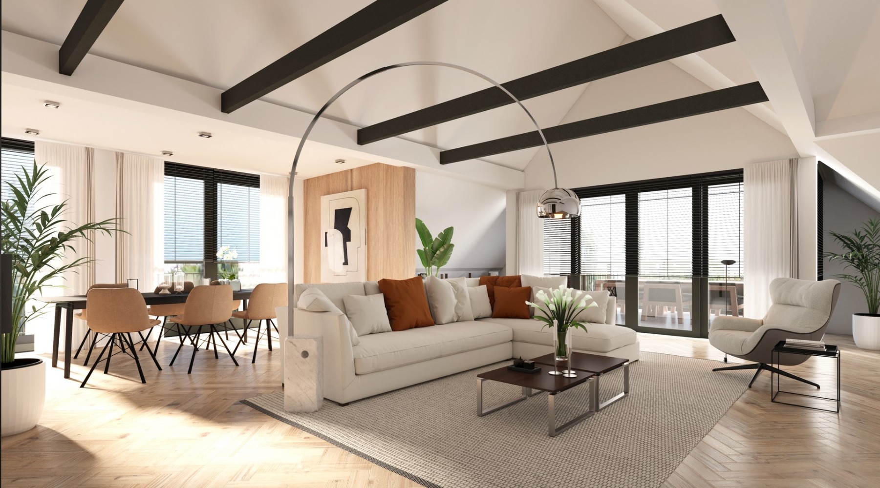 De appartementen op de bovenste verdieping hebben in de woonkamer extra hoogte omdat het plafond meeloopt met de kapvorm. Bovendien zijn in dat plafond heel grote dakramen aangebracht, waardoor een ongekende ruimtelijkheid ontstaat.
