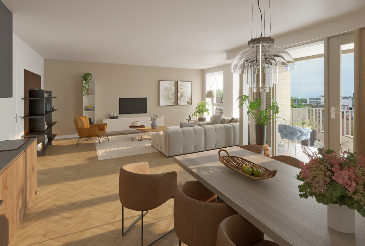De appartementen hebben een praktische indeling en een woonoppervlakte van circa 75 m² en hebben een koopprijs vanaf € 335.500,- v.o.n.. De lichte woonkamer met open keuken vormt het centrale leefgedeelte. Daarnaast beschikt ieder appartement over twee slaapkamers (circa 12 m² en 7 m²), ideaal als slaap-, werk- of logeerkamer. Dankzij de vloerverwarming en de energiezuinige uitvoering met energielabel A+++ woon je hier duurzaam, comfortabel en luxe.