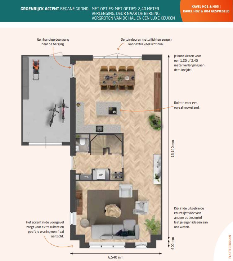 Woningmodel Groenrijck betreft bouwnummers H01 t/m H04 en is een royale twee-onder-een-kapwoning met volop ruimte en comfort. Optioneel kan de voorgevel worden voorzien van een stijlvol accent, wat extra ruimte creëert en zorgt voor een fraaie uitstraling. Elke woning beschikt over een gemetselde berging en twee parkeerplaatsen op eigen terrein. Bovendien geniet je van een prachtig uitzicht over het water. De bouwnummers H01 en H02 beschikken over bruine stenen.