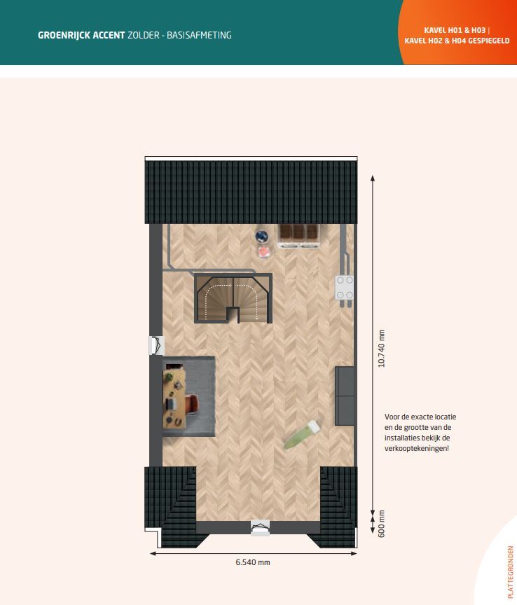 De woningen hebben een woonoppervlakte van circa 155 m² en een kaveloppervlakte van circa 324 m² t/m circa 344 m². Woningmodel Groenrijck is 6,54 meter breed en 10,74 meter diep. De ruime en lichte woonkamer aan de straatzijde is de perfecte plek voor een gezellige zithoek. De tuinzijde is ideaal voor je toekomstige droomkeuken. Daarnaast heeft deze woning in de basis al een aangebouwde gemetselde berging, erg handig. De eerste verdieping van deze woning heeft drie slaapkamers en een badkamer met een ligbad een douche, een wastafel en een tweede wandcloset. De zolder is een perfecte plek voor een speelruimte voor de kinderen of voor een handige werkplek. Hier staan technische installaties en is een aansluiting voor de wasmachine.