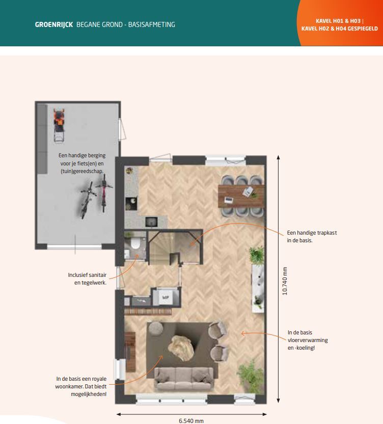 De woningen hebben een woonoppervlakte van circa 155 m² en een kaveloppervlakte van circa 324 m² t/m circa 344 m². Woningmodel Groenrijck is 6,54 meter breed en 10,74 meter diep. De ruime en lichte woonkamer aan de straatzijde is de perfecte plek voor een gezellige zithoek. De tuinzijde is ideaal voor je toekomstige droomkeuken. Daarnaast heeft deze woning in de basis al een aangebouwde gemetselde berging, erg handig. De eerste verdieping van deze woning heeft drie slaapkamers en een badkamer met een ligbad een douche, een wastafel en een tweede wandcloset. De zolder is een perfecte plek voor een speelruimte voor de kinderen of voor een handige werkplek. Hier staan technische installaties en is een aansluiting voor de wasmachine.