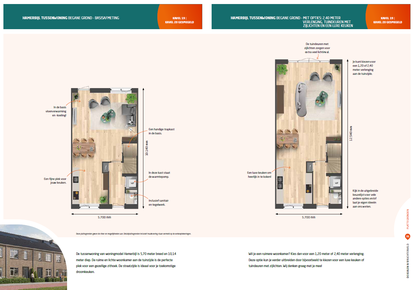 De tussenwoning van woningmodel Hamerbijl is 5,70 meter breed en 10,14 meter diep. De ruime en lichte woonkamer aan de tuinzijde is de perfecte plek voor een gezellige zithoek. De straatzijde is ideaal voor je toekomstige droomkeuken. De eerste verdieping van deze woning heeft drie slaapkamers en een badkamer met een douche, een wastafel en een tweede wandcloset. Op zolder staan de technische installaties en is de aansluiting van de wasmachine te vinden. Je zou hier bovendien een wasdroger, opbergkasten en een strijkplank kwijt kunnen. Daarnaast kun je optioneel kiezen voor bijvoorbeeld een hobbykamer.