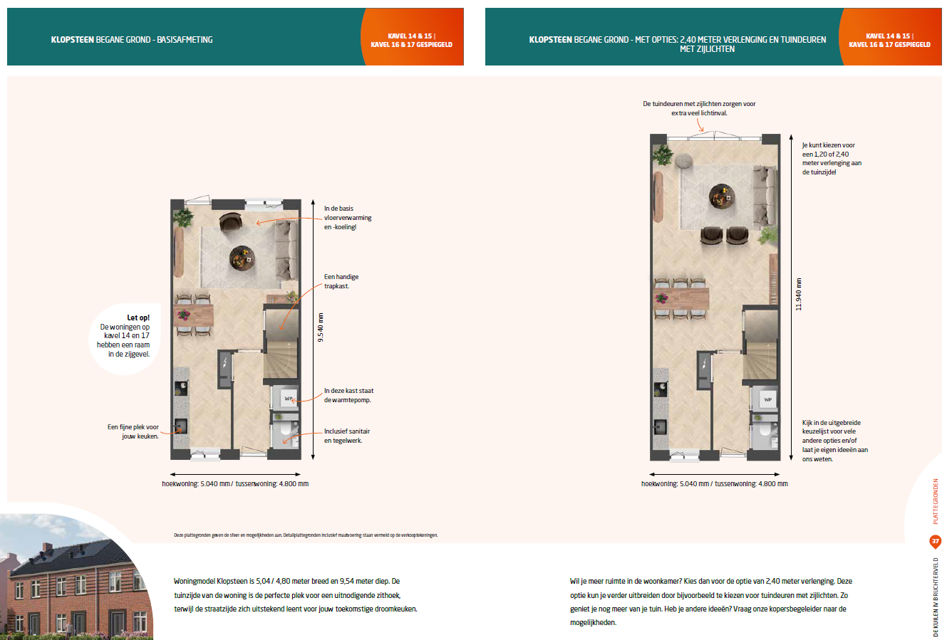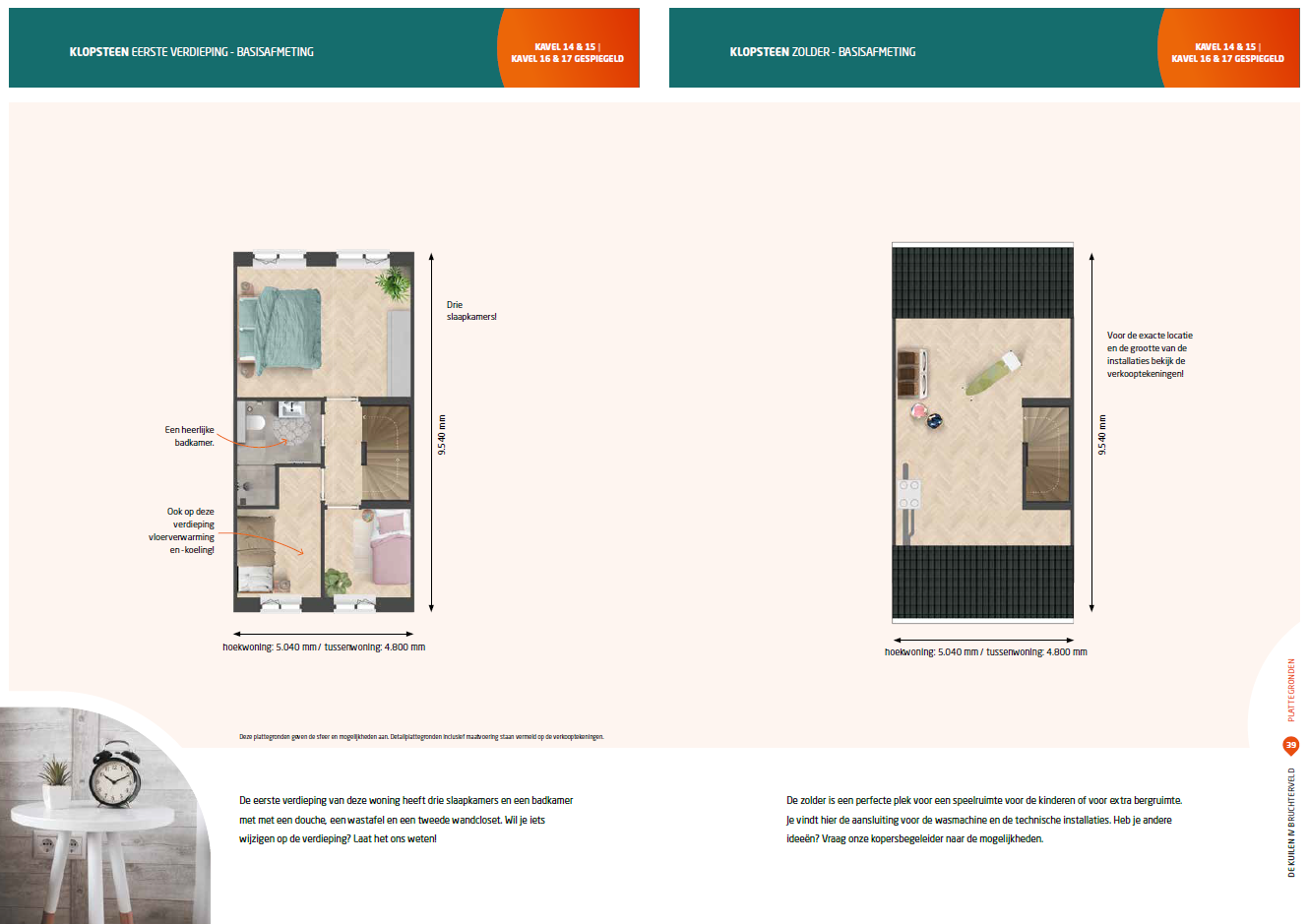 Woningmodel Klopsteen is een comfortabele, ruime en duurzame eengezinswoning. De 9 woningen hebben een woonoppervlakte van circa 100 m2 en een kaveloppervlakte van circa 86 m2 t/m circa 121 m2. Woningmodel Klopsteen is 5,04 (hoekwoning) of 4,80 meter breed (tussenwoning) en 9,54 meter diep. De tuinzijde van de woning is de perfecte plek voor een uitnodigende zithoek, terwijl de straatzijde zich uitstekend leent voor jouw toekomstige droomkeuken. In de achtertuin bevindt zich een praktische houten berging, ideaal voor fietsen of tuingereedschap. Hier woon je in een rustige omgeving met alle gemakken binnen handbereik. De eerste verdieping van deze woning heeft drie slaapkamers en een badkamer met met een douche, een wastafel en een tweede wandcloset. De zolder is een perfecte plek voor een speelruimte voor de kinderen of voor extra bergruimte. Je vindt hier de aansluiting voor de wasmachine en de technische installaties.