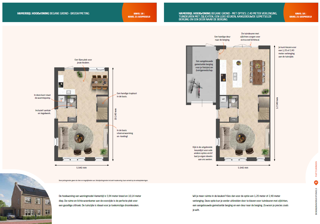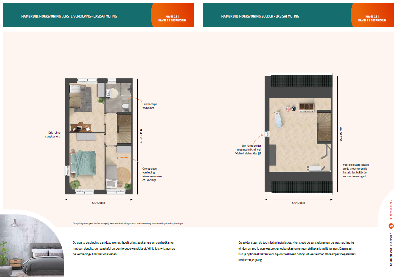 De hoekwoning van woningmodel Hamerbijl is 5,94 meter breed en 10,14 meter diep. De ruime en lichte woonkamer aan de voorzijde is de perfecte plek voor een gezellige zithoek. De tuinzijde is ideaal voor je toekomstige droomkeuken. De eerste verdieping van deze woning heeft drie slaapkamers en een badkamer met een douche, een wastafel en een tweede wandcloset. Op zolder staan de technische installaties. Hier is ook de aansluiting van de wasmachine te vinden en zou je een wasdroger, opbergkasten en een strijkplank kwijt kunnen. Daarnaast kun je optioneel kiezen voor bijvoorbeeld een hobby- of werkkamer.