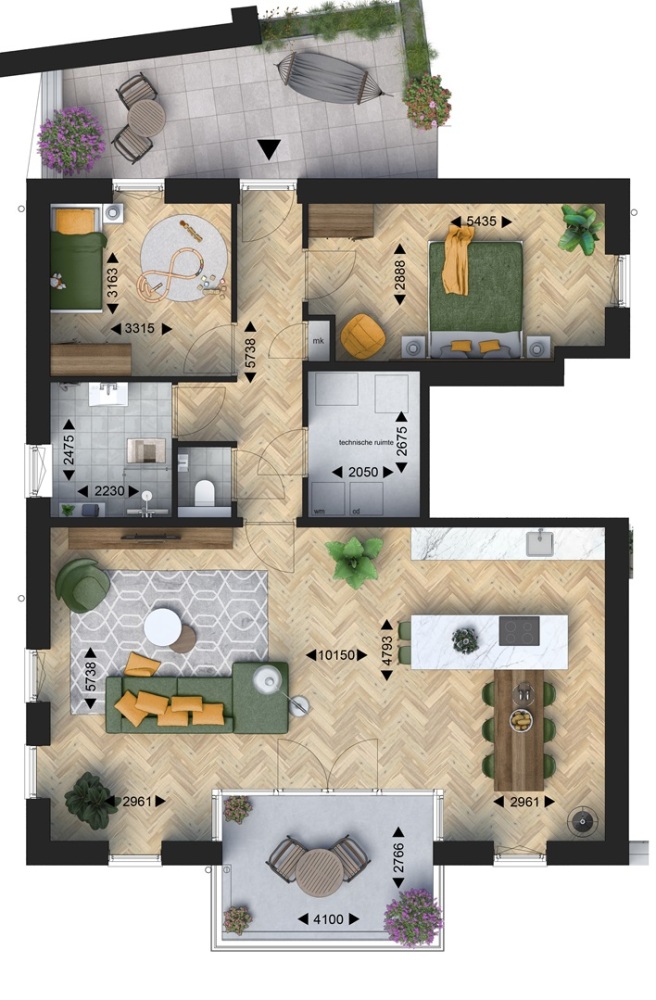 Rond deze natuurlijke oase wordt een zitrand gerealiseerd waar u samen met buren even “pas op de plaats” kunt maken. De terrassen van de appartementen worden van de binnentuin afgeschermd door plantenbakken met een eenduidige uitstraling. Op deze manier wordt de kwaliteit van de binnentuin voor u als koper gewaarborgd.